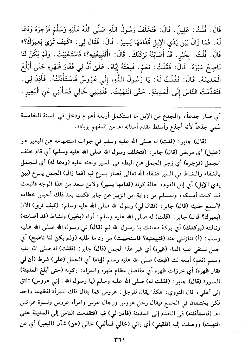 قَال: قُلْتُ: عَلِيلٌ. قَال: فَتَخَلَّفَ رَسُولُ الله صلى الله عَلَيهِ وَسلمَ فَزَجَرَهُ وَدَعَا لَهُ. فَمَا زَال بَينَ يَدَيِ الإِبِلِ قُدامَهَا يَسِيرُ. قَال: فَقَال لِي: "كَيفَ تَرَى بَعِيرَكَ؟ " قَال: قُلْتُ: بِخَيرٍ. قَدْ أصَابَتْهُ بَرَكَتُكَ. قَال: "أَفَتَبِيعُنِيهِ؟ " فَاسْتَحْيَيتُ. وَلَمْ يَكُنْ لَنَا نَاضِحٌ غيرُهُ. قَال: فَقُلْتُ: نَعَمْ. فَبِعْتُهُ إِياهُ. عَلَى أَن لِي فَقَارَ ظَهْرِهِ حَتى أَبْلُغَ الْمَدِينَةَ. قَال: فَقُلْتُ لَهُ: يَا رَسُولَ الله، إِني عَرُوسٌ فَاسْتَأْذَنْتُهُ. فَأَذِنَ لِي. فَتَقَدَّمْتُ النَّاسَ إِلَى الْمَدِينَةِ. حَتَّى انتَهَيتُ. فَلَقِيَنِي خَالِي فَسَأَلَنِي عَنِ الْبَعِيرِ