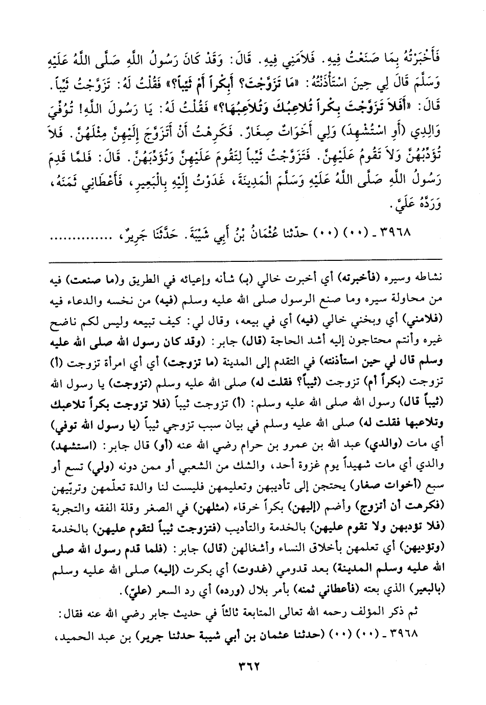 فَأخْبَرْتُهُ بِمَا صَنَعْتُ فِيهِ. فَلامَنِي فِيهِ. قَال: وَقَدْ كَانَ رَسُولُ الله صلى الله عَلَيهِ وَسلَّمَ قَال لِي حِينَ استَأْذَنْتُهُ: "مَا تَزَوَّجْتَ؟ أَبِكْرًا أَمْ ثَيِّبًا؟ " فَقُلْتُ لَهُ: تَزَوَّجْتُ ثَيِّبًا. قَال: "أَفَلا تَزَوَّجْتَ بِكْرًا تُلاعِبُكَ وَتُلاعِبُهَا؟ " فَقُلْتُ لَهُ: يَا رَسُولَ الله! تُوُفِّيَ وَالِدِي (أَو اسْتُشْهِدَ) وَلِي أَخَوَاتٌ صِغَارٌ. فَكَرِهْتُ أَنْ أَتَزَوَّجَ إِلَيهِن مِثْلَهُن. فَلَا تُؤَدِّبُهُن وَلَا تَقُومُ عَلَيهِنَّ. فَتَزَوَّجْتُ ثَيِّبًا لِتَقُومَ عَلَيهِن وَتُؤَدِّبَهُنَّ. قَال: فَلمّا قَدِمَ رَسُولُ الله صَلى الله عَلَيهِ وَسلمَ المَدِينَةَ، غَدَوْتُ إِلَيهِ بِالْبَعِيرِ، فَأَعْطَانِي ثَمَنَهُ، وَرَدَّهُ عَلَيَّ.