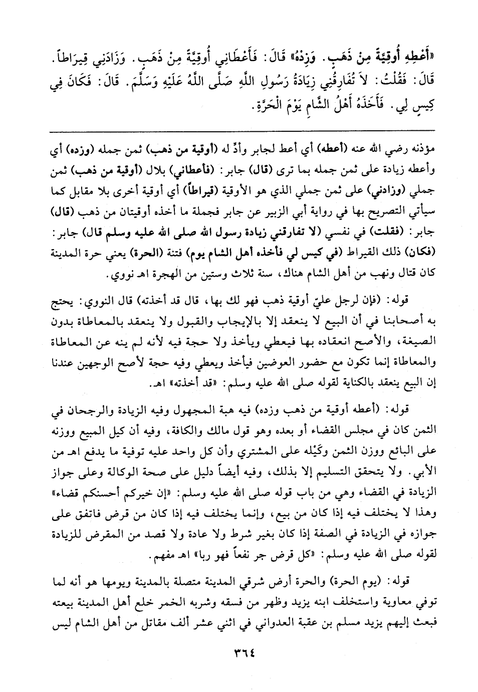 مؤذنه رضي الله عنه (أعطه) أي أعط لجابر وأدِّ له (أوقية من ذهب) ثمن جمله (وزده) أي وأعطه زيادة على ثمن جمله بما ترى (قال) جابر: (فأعطاني) بلال (أوقية من ذهب) ثمن جملي (وزادني) على ثمن جملي الذي هو الأوقية (قيراطًا) أي أوقية أخرى بلا مقابل كما سيأتي التصريح بها في رواية أبي الزبير عن جابر فجملة ما أخذه أوقيتان من ذهب (قال) جابر: (فقلت) في نفسي (لا تفارقني زيادة رسول الله صلى الله عليه وسلم قال) جابر: (فكان) ذلك القيراط (في كيس لي فأخذه أهل الشام يوم) فتنة (الحرة) يعني حرة المدينة كان قتال ونهب من أهل الشام هناك، سنة ثلاث وستين من الهجرة اهـ نووي.