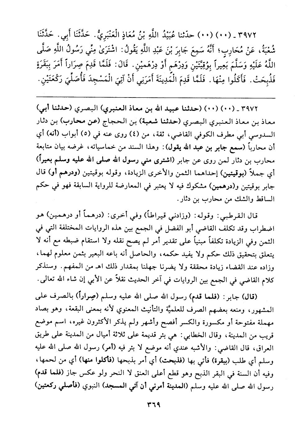 ٣٩٧٢ - (٠٠) (٠٠) حدَّثنا عُبَيدُ الله بن مُعَاذٍ الْعَنْبَرِيُّ. حَدَّثَنَا أَبِي. حَدَّثَنَا شُعْبَةُ، عَنْ مُحَارِبٍ؛ أَنَّهُ سَمِعَ جَابِرَ بْنَ عَبْدِ الله يَقُولُ: اشْتَرَى مِني رَسُول اللهِ صَلى اللهُ عَلَيهِ وسلَّمَ بَعِيرًا بِوقِيَّتَينِ وَدِرْهَمٍ أَوْ دِرْهَمينِ. قَال: فَلَمَّا قَدِمَ صِرَارًا أَمَرَ بِبَقَرَةٍ فَذُبِحَتْ. فَأَكَلُوا مِنْهَا. فَلَمَّا قَدِمَ الْمَدِينَةَ أَمَرَنِي أَنْ آتِيَ الْمَسْجِدَ فَأُصَلِّيَ رَكْعَتَينِ