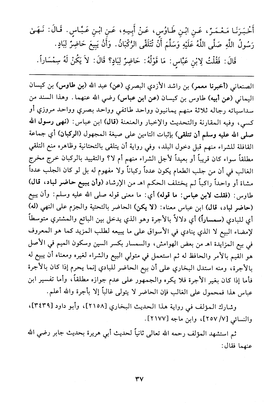 أَخْبَرَنَا مَعْمَرٌ، عَنِ ابْنِ طَاوُسٍ، عَنْ أَبِيهِ، عَنِ ابْنِ عَبَّاسٍ. قَال: نَهَى رَسُولُ اللهِ صَلَّى اللهُ عَلَيهِ وَسَلَّمَ أَنْ تُتَلَقَّى الرُّكْبَانُ. وَأَنْ يَبِيعَ حَاضِرٌ لِبَادٍ. قَال: فَقُلْتُ لِابْنِ عَبَّاسٍ: مَا قَوْلُهُ: حَاضِرٌ لِبَادٍ؟ قَال: لَا يَكُنْ لَهُ سِمْسَارًا