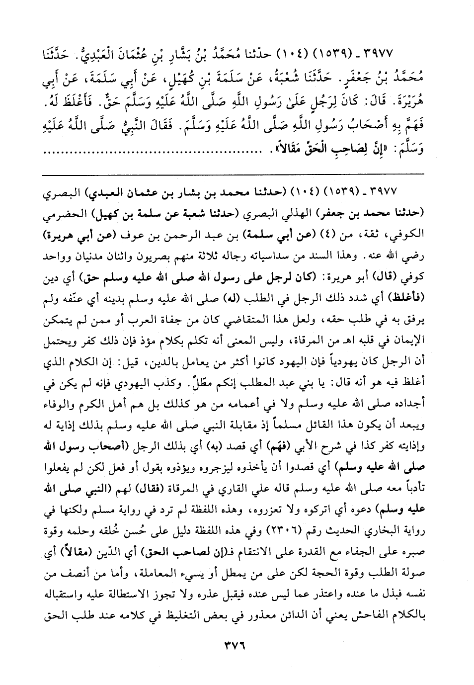 ٣٩٧٧ - (١٥٣٩) (١٠٤) حدَّثنا مُحَمَدُ بْنُ بَشَّارِ بْنِ عُثْمَانَ الْعَبْدِيُّ. حَدَّثَنَا مُحَمَّدُ بْنُ جَعْفَرٍ. حَدَّثَنَا شُعْبَةُ، عَنْ سَلَمَةَ بْنِ كُهَيلٍ، عَنْ أَبِي سَلَمَةَ، عَنْ أَبِي هُرَيرَةَ. قَال: كَانَ لِرَجُلٍ عَلَى رَسُولِ اللهِ صَلَّى اللهُ عَلَيهِ وَسَلَّمَ حَقٌّ. فَأَغْلَظَ لَهُ. فَهَمَّ بِهِ أَصْحَابُ رَسُولِ اللهِ صَلَّى اللهُ عَلَيهِ وَسَلَّمَ. فَقَال النَّبِيُّ صَلَّى اللهُ عَلَيهِ وَسَلَّمَ: "إِنَّ لِصَاحِبِ الْحَقِّ مَقَالًا"