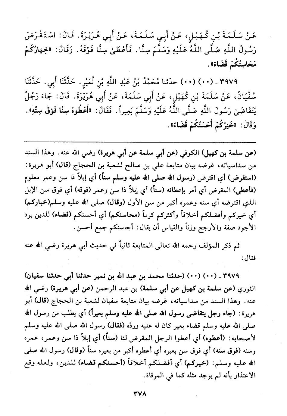 ثم ذكر المؤلف رحمه الله تعالى المتابعة ثانيًا في حديث أبي هريرة رضي الله عنه فقال: ٣٩٧٩ - (٠٠) (٠٠) (حدثنا محمد بن عبد الله بن نمير حدثنا أبي حدثنا سفيان) الثوري (عن سلمة بن كهيل عن أبي سلمة) بن عبد الرحمن (عن أبي هريرة) رضي الله عنه. وهذا السند من سداسياته، غرضه بيان متابعة سفيان لشعبة بن الحجاج (قال) أبو هريرة: (جاء رجل يتقاضى رسول الله صلى الله عليه وسلم بعيرًا) أي يطلب من رسول الله صلى الله عليه وسلم قضاء بعير كان له عليه وردّه (فقال) رسول الله صلى الله عليه وسلم لأصحابه: (أعطوه) أي أعطوا الرجل المقرض لنا (سنًّا) أي إبلًا ذا سن وعمر، عمره وسنه (فوق سنه) أي فوق سن بعيره أي أعطوه أكبر من بعيره سنًّا (وقال) رسول الله صلى الله عليه وسلم: (خيركم) أي أفضلكم أخلاقًا (أحسنكم قضاء) للدين، ولعله وقع الاعتذار بأنه لم يوجد مثله كما في المرقاة.