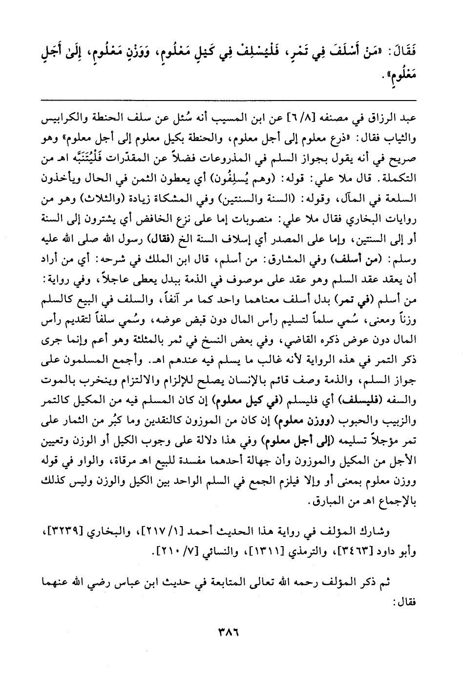 فَقَال: "مَنْ أَسْلَفَ فِي تَمْرٍ، فَلْيُسْلِف فِي كَيلٍ مَعْلُومٍ، وَوَزنٍ مَعْلُومٍ، إِلَى أَجَلٍ مَعْلُومٍ"