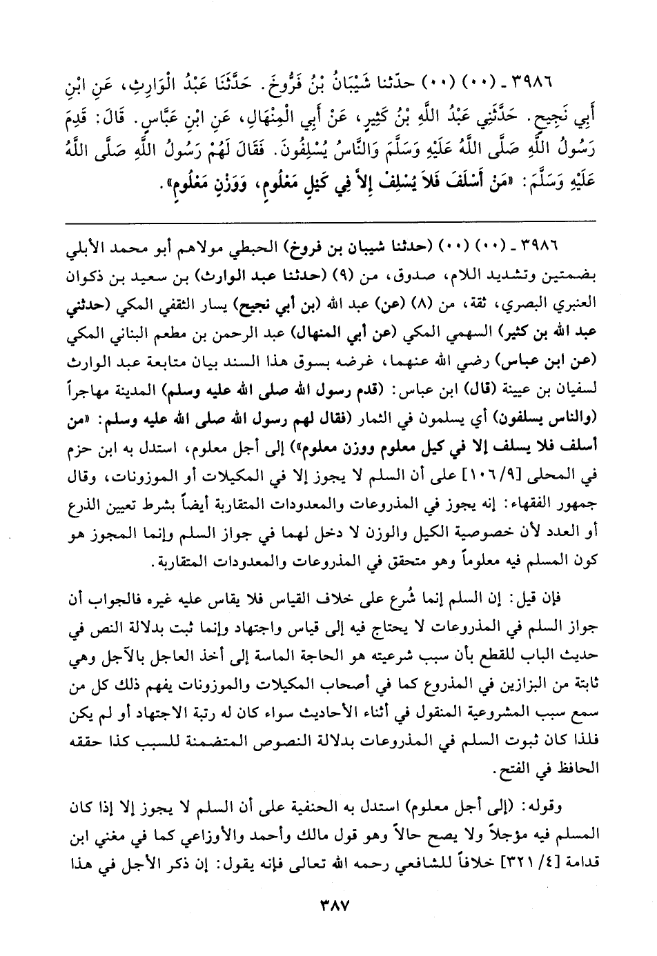 ٣٩٨٦ - (٠٠) (٠٠) (حدثنا شيبان بن فروخ) الحبطي مولاهم أبو محمد الأبلي بضمتين وتشديد اللام، صدوق، من (٩) (حدثنا عبد الوارث) بن سعيد بن ذكوان العنبري البصري، ثقة، من (٨) (عن) عبد الله (بن أبي نجيح) يسار الثقفي المكي (حدثني عبد الله بن كثير) السهمي المكي (عن أبي المنهال) عبد الرحمن بن مطعم البناني المكي (عن ابن عباس) رضي الله عنهما، غرضه بسوق هذا السند بيان متابعة عبد الوارث لسفيان بن عيينة (قال) ابن عباس: (قدم رسول الله صلى الله عليه وسلم) المدينة مهاجرًا (والناس يسلفون) أي يسلمون في الثمار (فقال لهم رسول الله صلى الله عليه وسلم: (من أسلف فلا يسلف إلا في كيل معلوم ووزن معلوم) إلى أجل معلوم، استدل به ابن حزم في المحلى [٩/ ١٠٦] على أن السلم لا يجوز إلا في المكيلات أو الموزونات، وقال جمهور الفقهاء: إنه يجوز في المذروعات والمعدودات المتقاربة أيضًا بشرط تعيين الذرع أو العدد لأن خصوصية الكيل والوزن لا دخل لهما في جواز السلم وإنما المجوز هو كون المسلم فيه معلومًا وهو متحقق في المذروعات والمعدودات المتقاربة.