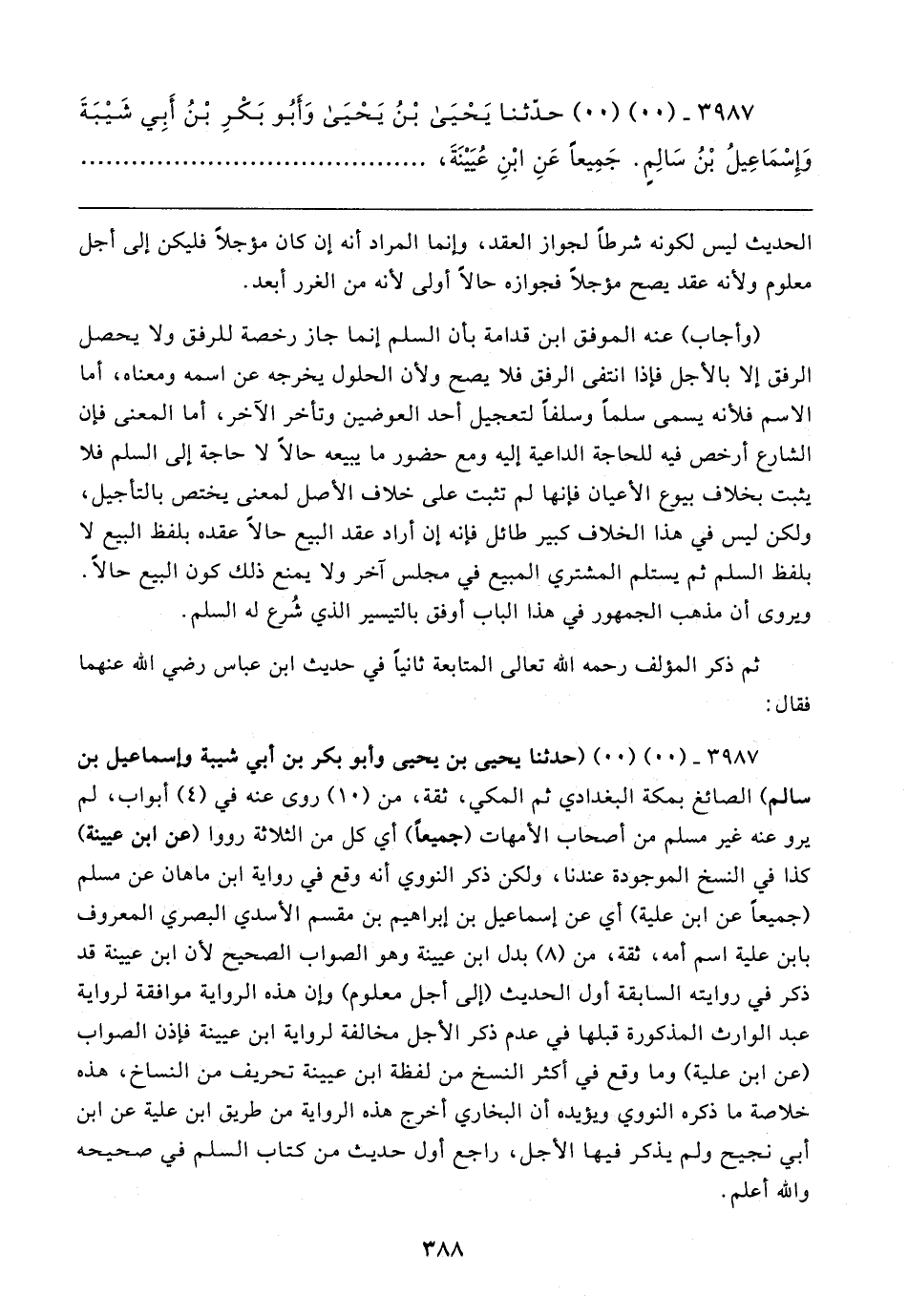 ٣٩٨٧ - (٠٠) (٠٠) (حدثنا يحيى بن يحيى وأبو بكر بن أبي شيبة وإسماعيل بن سالم) الصائغ بمكة البغدادي ثم المكي، ثقة، من (١٠) روى عنه في (٤) أبواب، لم يرو عنه غير مسلم من أصحاب الأمهات (جميعًا) أي كل من الثلاثة رووا (عن ابن عيينة) كذا في النسخ الموجودة عندنا، ولكن ذكر النووي أنه وقع في رواية ابن ماهان عن مسلم (جميعًا عن ابن علية) أي عن إسماعيل بن إبراهيم بن مقسم الأسدي البصري المعروف بابن علية اسم أمه، ثقة، من (٨) بدل ابن عيينة وهو الصواب الصحيح لأن ابن عيينة قد ذكر في روايته السابقة أول الحديث (إلى أجل معلوم) وإن هذه الرواية موافقة لرواية عبد الوارث المذكورة قبلها في عدم ذكر الأجل مخالفة لرواية ابن عيينة فإذن الصواب (عن ابن علية) وما وقع في أكثر النسخ من لفظة ابن عيينة تحريف من النساخ، هذه خلاصة ما ذكره النووي ويؤيده أن البخاري أخرج هذه الرواية من طريق ابن علية عن ابن أبي نجيح ولم يذكر فيها الأجل، راجع أول حديث من كتاب السلم في صحيحه والله أعلم.