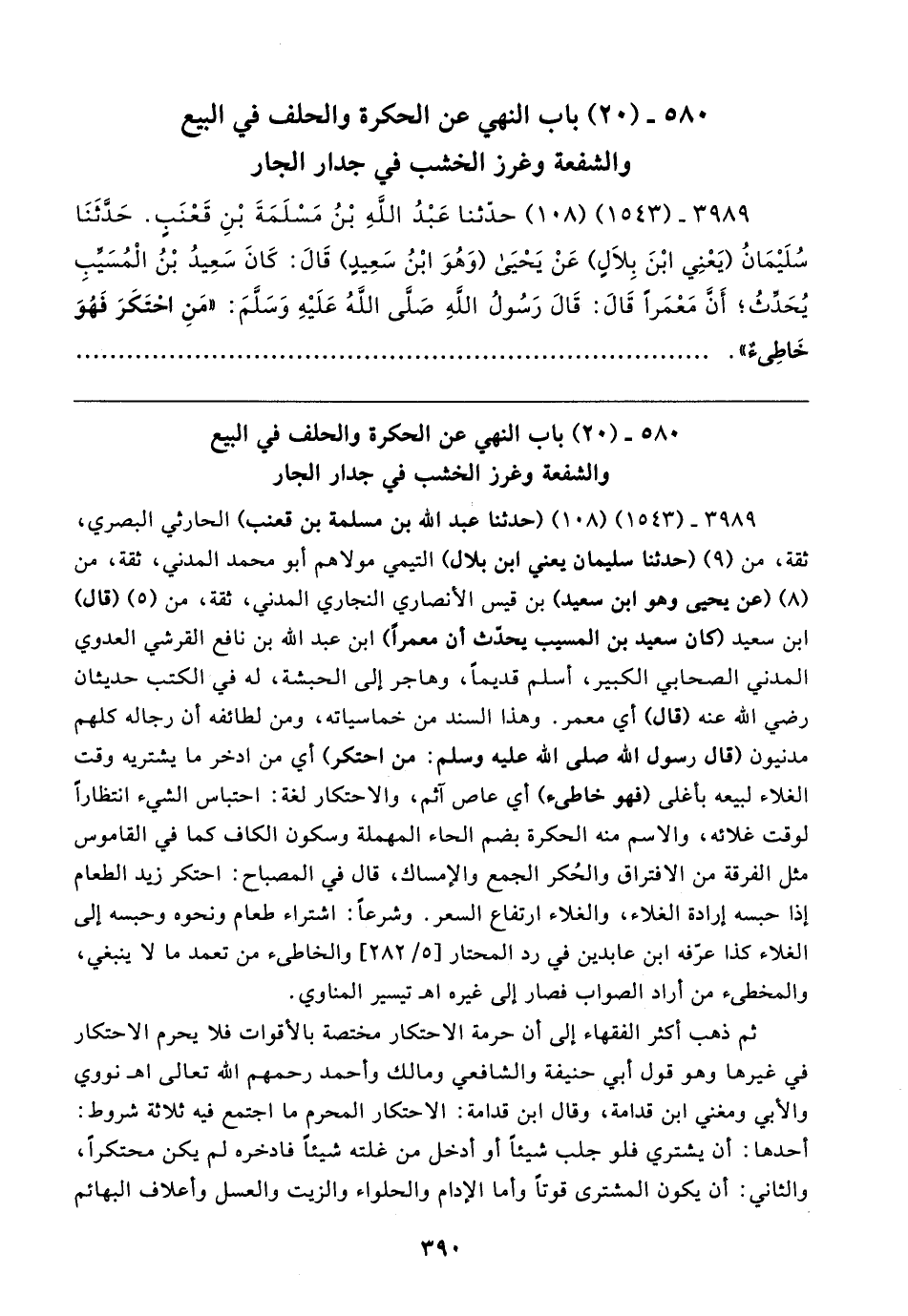 ٣٩٨٩ - (١٥٤٣) (١٠٨) (حدثنا عبد الله بن مسلمة بن قعنب) الحارثي البصري، ثقة، من (٩) (حدثنا سليمان يعني ابن بلال) التيمي مولاهم أبو محمد المدني، ثقة، من (٨) (عن يحيى وهو ابن سعيد) بن قيس الأنصاري النجاري المدني، ثقة، من (٥) (قال) ابن سعيد كان سعيد بن المسيب يحدّث أن معمرًا) ابن عبد الله بن نافع القرشي العدوي المدني الصحابي الكبير، أسلم قديمًا، وهاجر إلى الحبشة، له في الكتب حديثان رضي الله عنه (قال) أي معمر. وهذا السند من خماسياته، ومن لطائفه أن رجاله كلهم مدنيون (قال رسول الله صلى الله عليه وسلم: من احتكر) أي من ادخر ما يشتريه وقت الغلاء لبيعه بأغلى (فهو خاطئ) أي عاص آثم، والاحتكار لغة: احتباس الشيء انتظارًا لوقت غلائه، والاسم منه الحكرة بضم الحاء المهملة وسكون الكاف كما في القاموس مثل الفرقة من الافتراق والحُكر الجمع والإمساك، قال في المصباح: احتكر زيد الطعام إذا حبسه إرادة الغلاء، والغلاء ارتفاع السعر. وشرعًا: اشتراء طعام ونحوه وحبسه إلى الغلاء كذا عرّفه ابن عابدين في رد المحتار [٥/ ٢٨٢] والخاطئ من تعمد ما لا ينبغي، والمخطئ من أراد الصواب فصار إلى غيره اهـ تيسير المناوي.