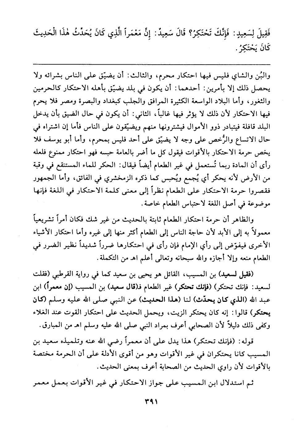 فَقِيلَ لِسَعِيدٍ: فَإِنَّكَ تَحْتَكِرُ؟ قَال سَعِيدٌ: إِن مَعْمَرًا الَّذِي كَانَ يُحَدِّثُ هذَا الْحَدِيثَ كَانَ يَحْتَكِرُ