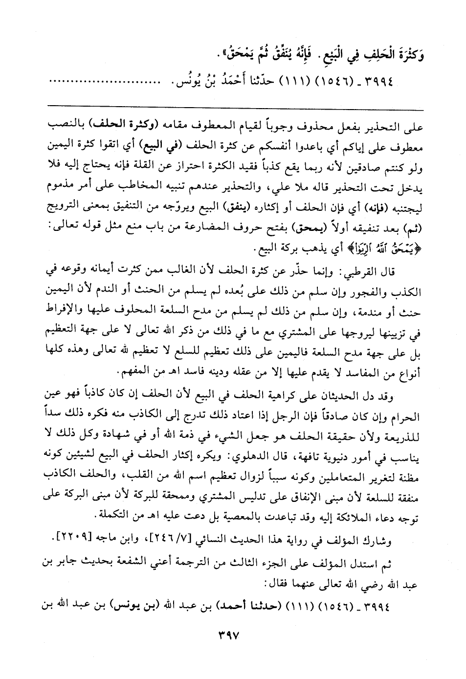 وَكثْرَةَ الْحَلِفِ فِي الْبَيعِ. فَإِنَّهُ يُنَفِّقُ ثُمَّ يَمْحَقُ".