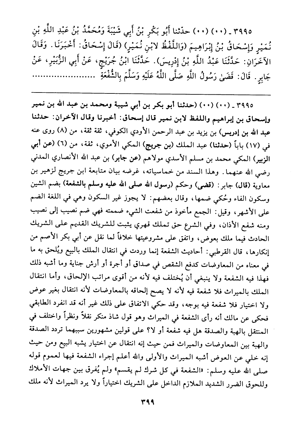٣٩٩٥ - (٠٠) (٠٠) حدَّثنا أَبُو بَكْرٍ بْنُ أَبِي شَيبَةَ وَمُحَمَّدُ بْنُ عَبْدِ اللهِ بْنِ نُمَيرٍ وَإِسْحَاقُ بْنُ إِبْرَاهِيمَ (وَاللَّفْظُ لابْنِ نُمَيرٍ) (قَال إِسْحَاقُ: أخْبَرَنَا. وَقَال الآخَرَانِ: حَدَّثَنَا عَبْدُ اللهِ بْنُ إِدْرِيسَ). حَدَّثَنَا ابْنُ جُرَيجٍ، عَنْ أَبِي الزُّبَيرِ، عَنْ جَابِرٍ. قَال: قَضَى رَسُولُ اللهِ صَلَّى اللهُ عَلَيهِ وَسَلَّمَ بِالشُّفْعَةِ