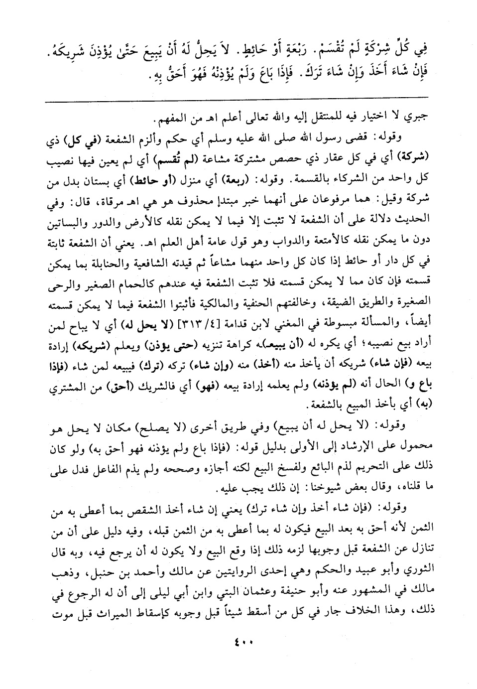 وقوله: قضى رسول الله صلى الله عليه وسلم أي حكم وألزم الشفعة (في كل) ذي (شركة) أي في كل عقار ذي حصص مشتركة مشاعة (لم تُقسم) أي لم يعين فيها نصيب كل واحد من الشركاء بالقسمة. وقوله: (ربعة) أي منزل (أو حائط) أي بستان بدل من شركة وقيل: هما مرفوعان على أنهما خبر مبتدإ محذوف هو هي اهـ مرقاة، قال: وفي الحديث دلالة على أن الشفعة لا تثبت إلا فيما لا يمكن نقله كالأرض والدور والبساتين دون ما يمكن نقله كالأمتعة والدواب وهو قول عامة أهل العلم اهـ. يعني أن الشفعة ثابتة في كل دار أو حائط إذا كان كل واحد منهما مشاعًا ثم قيدته الشافعية والحنابلة بما يمكن قسمته فإن كان مما لا يمكن قسمته فلا تثبت الشفعة فيه عندهم كالحمام الصغير والرحى الصغيرة والطريق الضيقة، وخالفتهم الحنفية والمالكية فأثبتوا الشفعة فيما لا يمكن قسمته أيضًا، والمسألة مبسوطة في المغني لابن قدامة [٤/ ٣١٣] (لا يحل له) أي لا يباح لمن أراد بيع نصيبه؛ أي يكره له (أن يبيع) ـه كراهة تنزيه (حتى يؤذن) ويعلم (شريكه) إرادة بيعه (فإن شاء) شريكه أن يأخذ منه (أخذ) منه (وإن شاء) تركه (ترك) فيبيعه لمن شاء (فإذا باع و) الحال أنه (لم يؤذنه) ولم يعلمه إرادة بيعه (فهو) أي فالشريك (أحق) من المشتري (به) أي بأخذ المبيع بالشفعة.