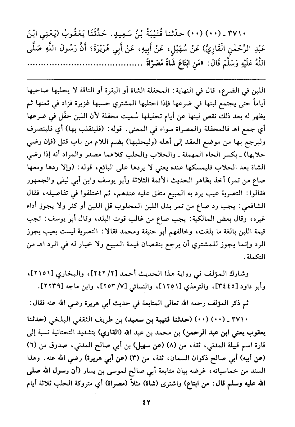٣٧١٠ - (٠٠) (٠٠) (حدثنا قتيبة بن سعيد) بن طريف الثقفي البلخي (حدثنا يعقوب يعني ابن عبد الرحمن) بن محمد بن عبد الله (القاري) بتشديد التحتانية نسبة إلى قارة اسم قبيلة المدني، ثقة، من (٨) (عن سهيل) بن أبي صالح المدني، صدوق من (٦) (عن أبيه) أبي صالح ذكوان السمان، ثقة، من (٣) (عن أبي هريرة) رضي الله عنه. وهذا السند من خماسياته، غرضه بيان متابعة أبي صالح لموسى بن يسار (أن رسول الله صلى الله عليه وسلم قال: من ابتاع) واشترى (شاة) مثلًا (مصراة) أي متروكة الحلب ثلاثة أيام