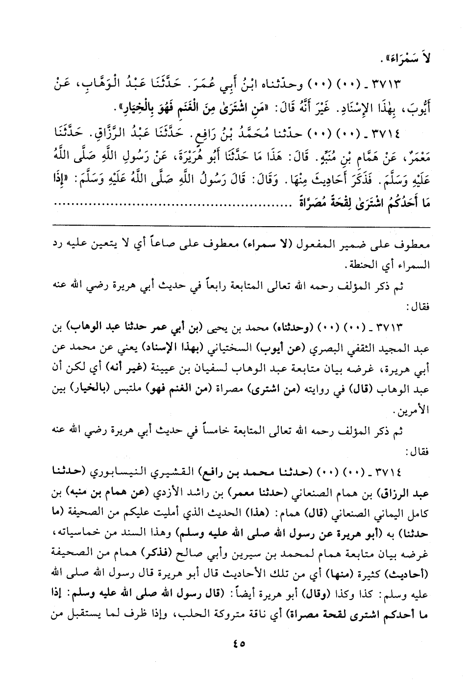 ٣٧١٤ - (٠٠) (٠٠) (حدثنا محمد بن رافع) القشيري النيسابوري (حدثنا عبد الرزاق) بن همام الصنعاني (حدثنا معمر) بن راشد الأزدي (عن همام بن منبه) بن كامل اليماني الصنعاني (قال) همام: (هذا) الحديث الذي أمليت عليكم من الصحيفة (ما حدثنا) به (أبو هريرة عن رسول الله صلى الله عليه وسلم) وهذا السند من خماسياته، غرضه بيان متابعة همام لمحمد بن سيرين وأبي صالح (فذكر) همام من الصحيفة (أحاديث) كثيرة (منها) أي من تلك الأحاديث قال أبو هريرة قال رسول الله صلى الله عليه وسلم: كذا وكذا (وقال) أبو هريرة أيضًا: (قال رسول الله صلى الله عليه وسلم: إذا ما أحدكم اشترى لقحة مصراة) أي ناقة متروكة الحلب، وإذا ظرف لما يستقبل من