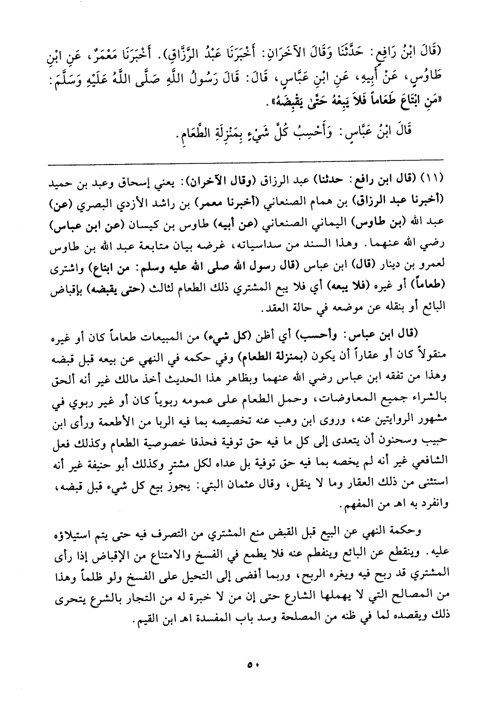 (قَال ابْنُ رَافِعٍ: حَدَّثَنَا وَقَال الآخَرَانِ: أَخْبَرَنَا عَبْدُ الرَّزَّاقِ). أَخْبَرَنَا مَعْمَرٌ، عَنِ ابْنِ طَاوُسٍ، عَنْ أَبِيهِ، عَنِ ابْنِ عَبَّاسٍ، قَال: قَال رَسُولُ اللهِ صَلَّى اللهُ عَلَيهِ وَسَلَّمَ: "مَنِ ابْتَاعَ طَعَامًا فَلَا يَبِعْهُ حتَّى يَقْبِضَهُ".