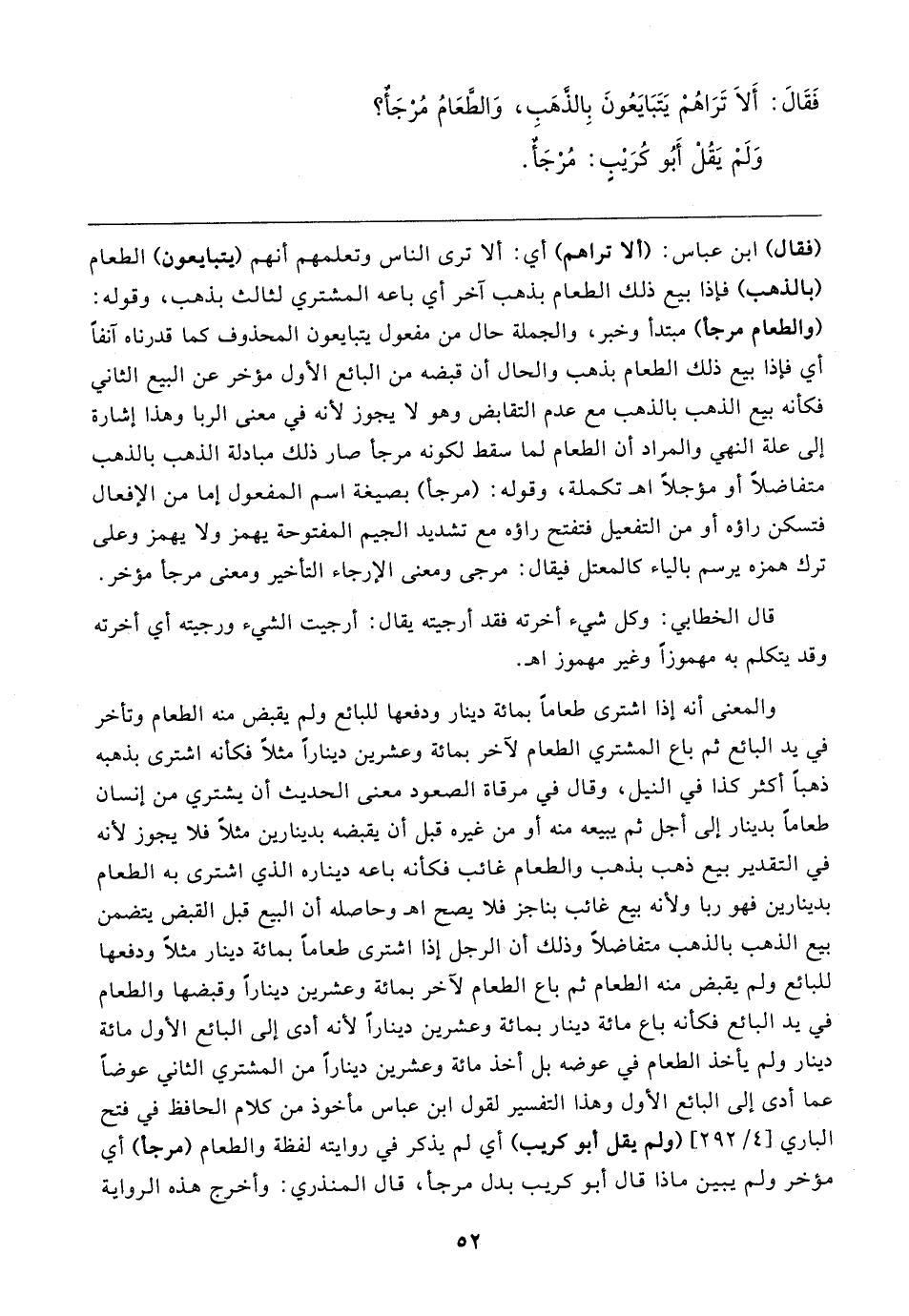 (فقال) ابن عباس: (ألا تراهم) أي: ألا ترى الناس وتعلمهم أنهم (يتبايعون) الطعام (بالذهب) فإذا بيع ذلك الطعام بذهب آخر أي باعه المشتري لثالث بذهب، وقوله: (والطعام مرجأ) مبتدأ وخبر، والجملة حال من مفعول يتبايعون المحذوف كما قدرناه آنفًا أي فإذا بيع ذلك الطعام بذهب والحال أن قبضه من البائع الأول مؤخر عن البيع الثاني فكأنه بيع الذهب بالذهب مع عدم التقابض وهو لا يجوز لأنه في معنى الربا وهذا إشارة إلى علة النهي والمراد أن الطعام لما سقط لكونه مرجأ صار ذلك مبادلة الذهب بالذهب متفاضلًا أو مؤجلًا اهـ تكملة، وقوله: (مرجأ) بصيغة اسم المفعول إما من الإفعال فتسكن راؤه أو من التفعيل فتفتح راؤه مع تشديد الجيم المفتوحة يهمز ولا يهمز وعلى ترك همزه يرسم بالياء كالمعتل فيقال: مرجى ومعنى الإرجاء التأخير ومعنى مرجأ مؤخر.