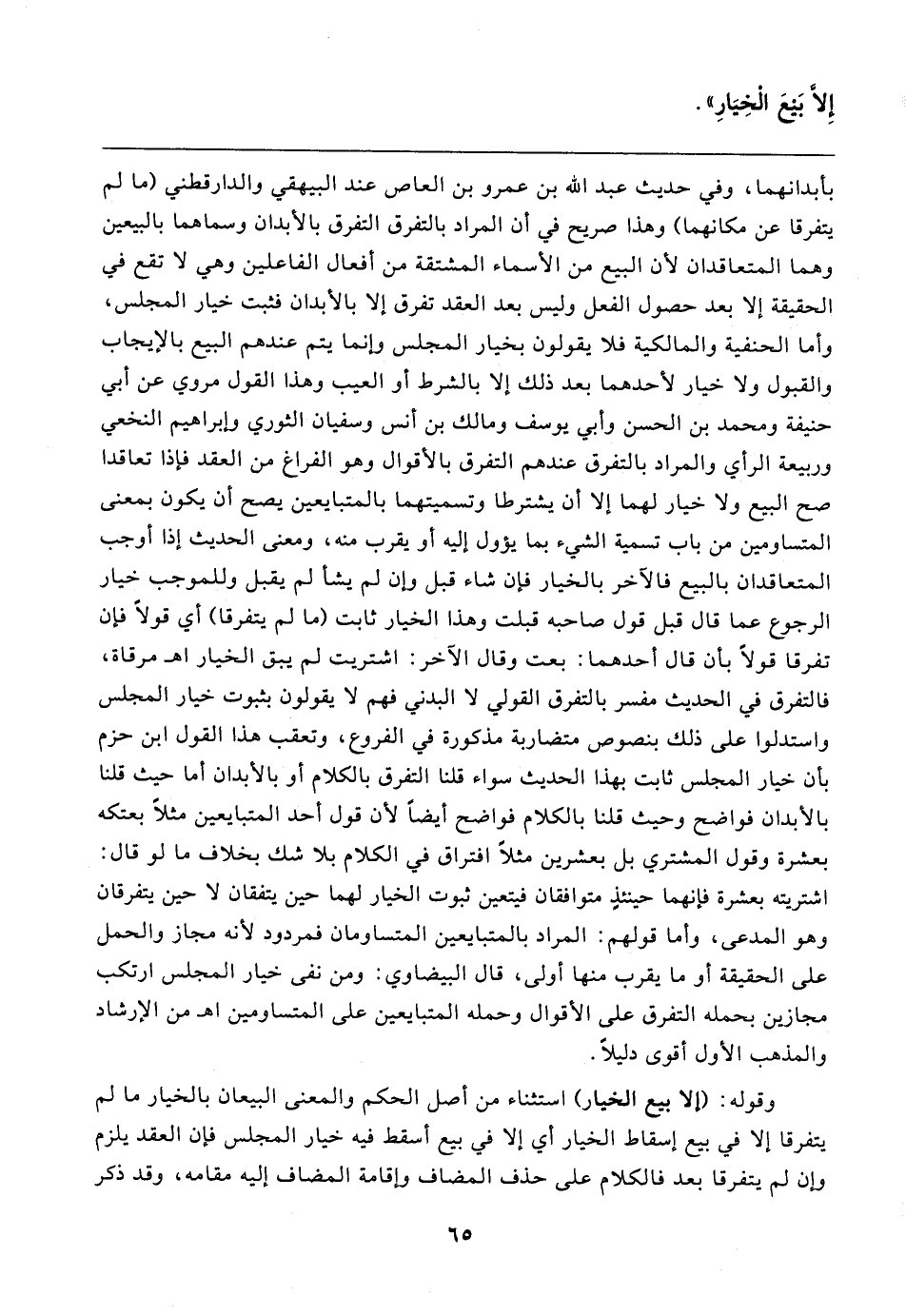 بأبدانهما، وفي حديث عبد الله بن عمرو بن العاص عند البيهقي والدارقطني (ما لم يتفرقا عن مكانهما) وهذا صريح في أن المراد بالتفرق التفرق بالأبدان وسماهما بالبيعين وهما المتعاقدان لأن البيع من الأسماء المشتقة من أفعال الفاعلين وهي لا تقع في الحقيقة إلا بعد حصول الفعل وليس بعد العقد تفرق إلا بالأبدان فثبت خيار المجلس، وأما الحنفية والمالكية فلا يقولون بخيار المجلس وإنما يتم عندهم البيع بالإيجاب والقبول ولا خيار لأحدهما بعد ذلك إلا بالشرط أو العيب وهذا القول مروي عن أبي حنيفة ومحمد بن الحسن وأبي يوسف ومالك بن أنس وسفيان الثوري وإبراهيم النخعي وربيعة الرأي والمراد بالتفرق عندهم التفرق بالأقوال وهو الفراغ من العقد فإذا تعاقدا صح البيع ولا خيار لهما إلا أن يشترطا وتسميتهما بالمتبايعين يصح أن يكون بمعنى المتساومين من باب تسمية الشيء بما يؤول إليه أو يقرب منه، ومعنى الحديث إذا أوجب المتعاقدان بالبيع فالآخر بالخيار فإن شاء قبل وإن لم يشأ لم يقبل وللموجب خيار الرجوع عما قال قبل قول صاحبه قبلت وهذا الخيار ثابت (ما لم يتفرقا) أي قولًا فإن تفرقا قولًا بأن قال أحدهما: بعت وقال الآخر: اشتريت لم يبق الخيار اهـ مرقاة، فالتفرق في الحديث مفسر بالتفرق القولي لا البدني فهم لا يقولون بثبوت خيار المجلس واستدلوا على ذلك بنصوص متضاربة مذكورة في الفروع، وتعقب هذا القول ابن حزم بأن خيار المجلس ثابت بهذا الحديث سواء قلنا التفرق بالكلام أو بالأبدان أما حيث قلنا بالأبدان فواضح وحيث قلنا بالكلام فواضح أيضًا لأن قول أحد المتبايعين مثلًا بعتكه بعشرة وقول المشتري بل بعشرين مثلًا افتراق في الكلام بلا شك بخلاف ما لو قال: اشتريته بعشرة فإنهما حينئذٍ متوافقان فيتعين ثبوت الخيار لهما حين يتفقان لا حين يتفرقان وهو المدعى، وأما قولهم: المراد بالمتبايعين المتساومان فمردود لأنه مجاز والحمل على الحقيقة أو ما يقرب منها أولى، قال البيضاوي: ومن نفى خيار المجلس ارتكب مجازين بحمله التفرق على الأقوال وحمله المتبايعين على المتساومين اهـ من الإرشاد والمذهب الأول أقوى دليلًا.