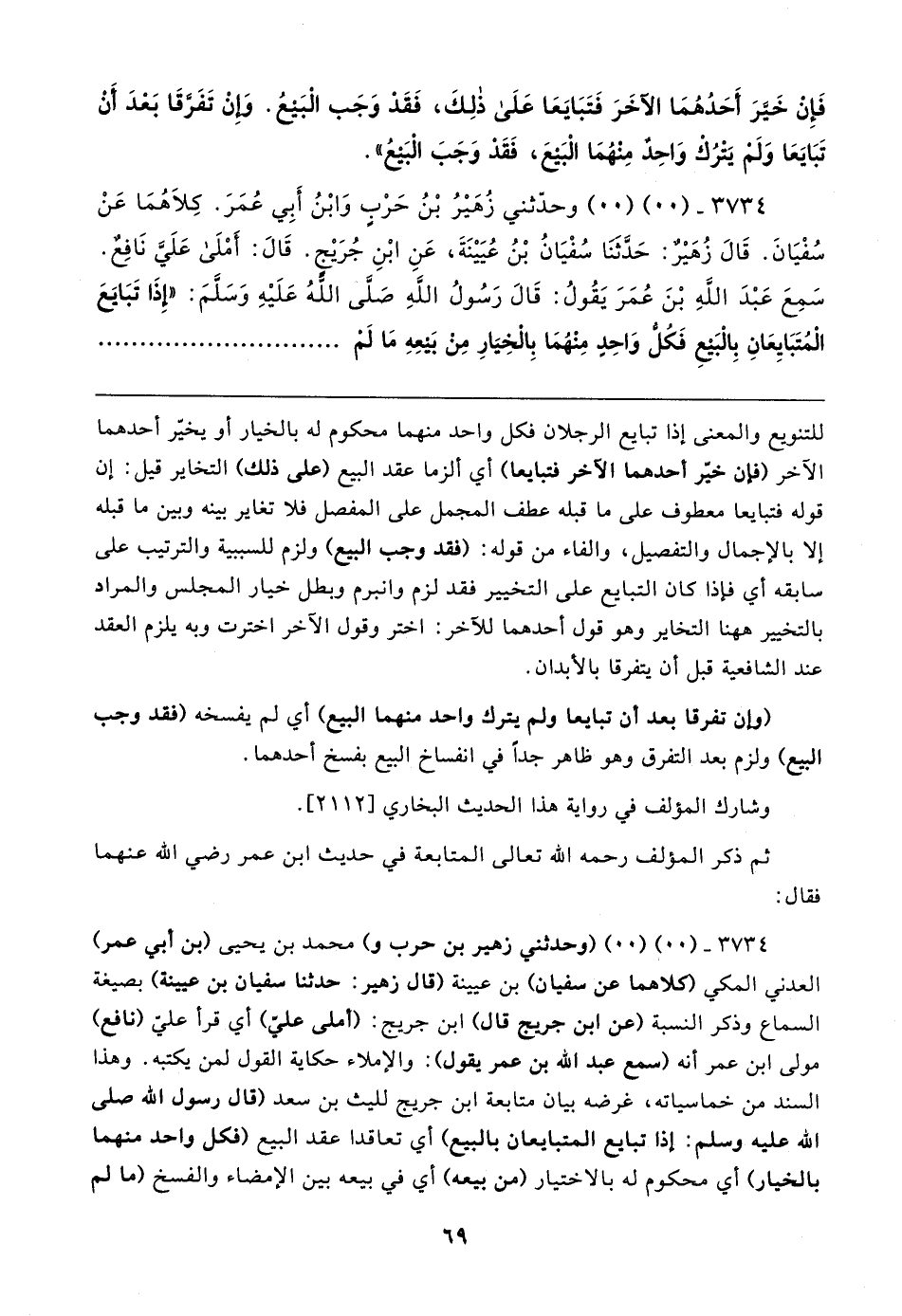 ٣٧٣٤ - (٠٠) (٠٠) (وحدثني زهير بن حرب و) محمد بن يحيى (بن أبي عمر) العدني المكي (كلاهما عن سفيان) بن عيينة (قال زهير: حدثنا سفيان بن عيينة) بصيغة السماع وذكر النسبة (عن ابن جريج قال) ابن جريج: (أملى عليّ) أي قرأ عليّ (نافع) مولى ابن عمر أنه (سمع عبد الله بن عمر يقول): والإملاء حكاية القول لمن يكتبه. وهذا السند من خماسياته، غرضه بيان متابعة ابن جريج لليث بن سعد (قال رسول الله صلى الله عليه وسلم: إذا تبايع المتبايعان بالبيع) أي تعاقدا عقد البيع (فكل واحد منهما بالخيار) أي محكوم له بالاختيار (من بيعه) أي في بيعه بين الإمضاء والفسخ (ما لم