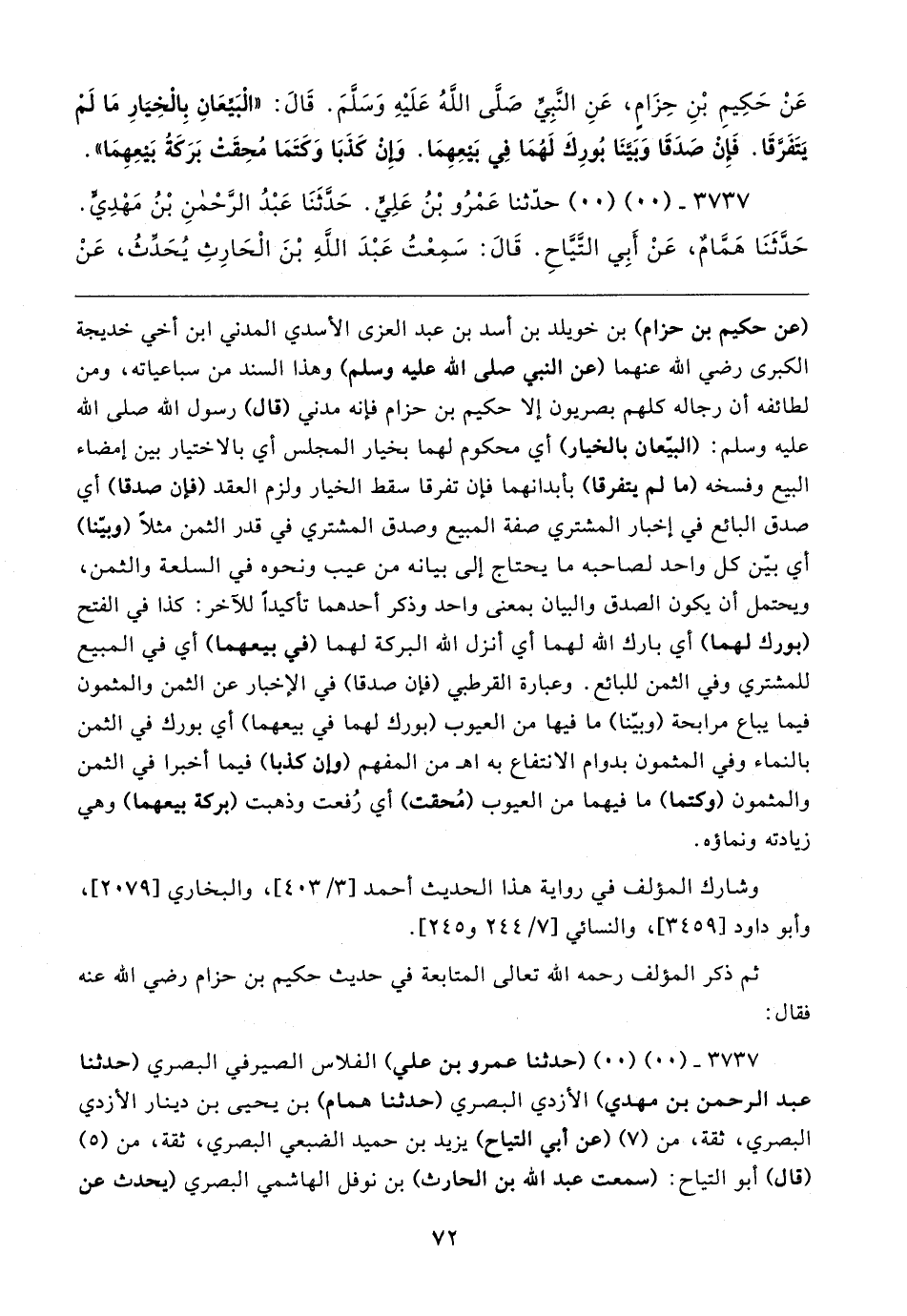 عَنْ حَكِيمِ بْنِ حِزَامٍ، عَنِ النَّبِيِّ صَلَّى اللهُ عَلَيهِ وَسَلَّمَ. قَال: "الْبَيِّعَانِ بِالْخِيَارِ مَا لَمْ يَتَفَرَّقَا. فَإِنْ صَدَقَا وَبَيَّنَا بُورِكَ لَهُمَا فِي بَيعِهِمَا. وَإِنْ كَذَبَا وَكَتَمَا مُحِقَتْ بَرَكَةُ بَيعِهِمَا".