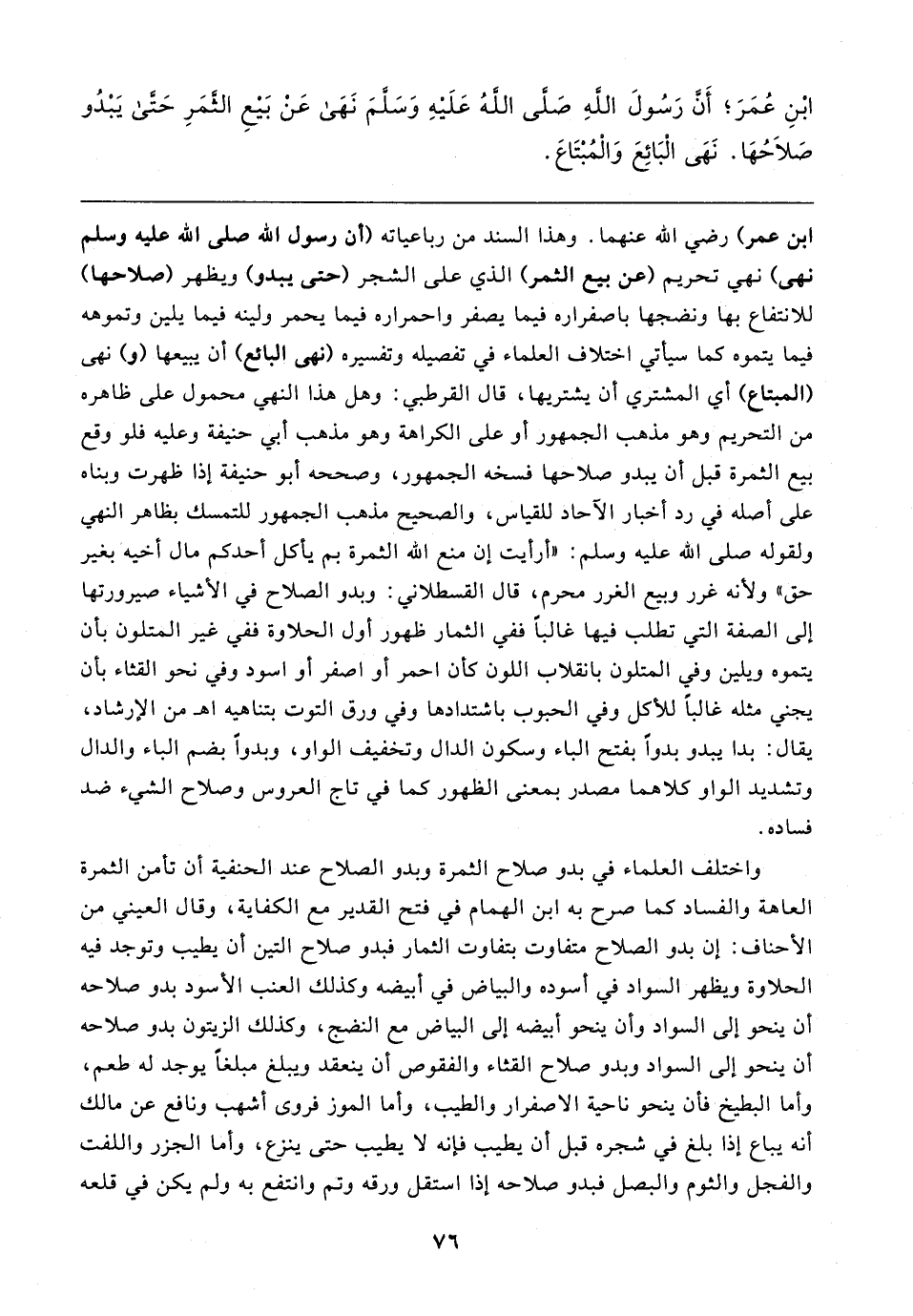 ابْنِ عُمَرَ؛ أَن رَسُولَ اللهِ صَلَّى اللهُ عَلَيهِ وَسَلَّمَ نَهَى عَنْ بَيعِ الثَّمَرِ حَتَّى يَبْدُو صَلاحُهَا. نَهَى الْبَائِعَ وَالْمُبْتَاعَ