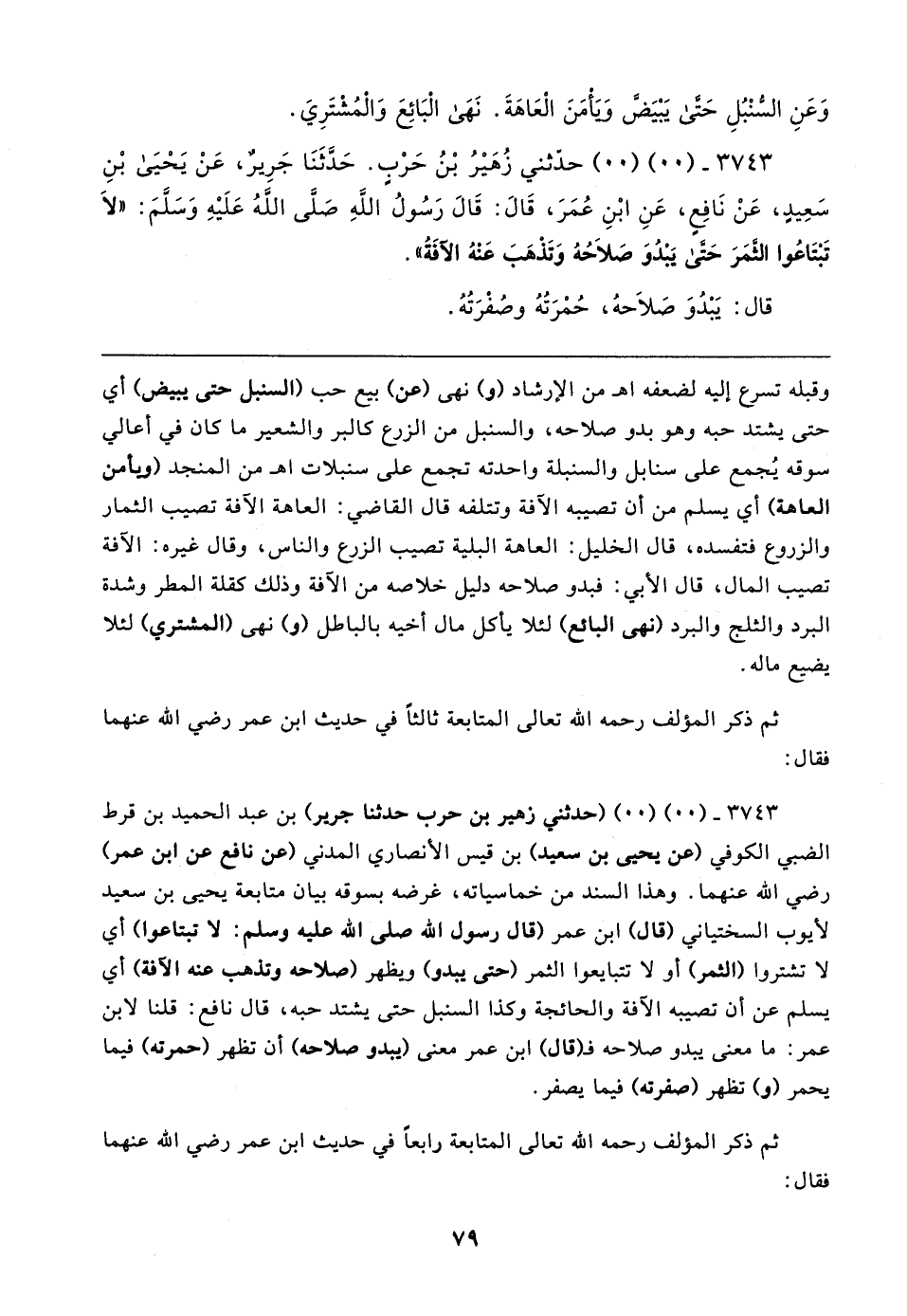 ٣٧٤٣ - (٠٠) (٠٠) حدّثني زُهَيرُ بْنُ حَرْبٍ. حَدَّثَنَا جَرِيرٌ، عَنْ يَحْيَى بْنِ سَعِيدٍ، عَنْ نَافِعٍ، عَنِ ابْنِ عُمَرَ، قَال: قَال رَسُولُ اللهِ صَلَّى اللهُ عَلَيهِ وَسَلَّمَ: "لَا تَبْتَاعُوا الثَّمَرَ حَتى يَبْدُوَ صَلاحُهُ وَتَذْهَبَ عَنْهُ الآفَةُ".