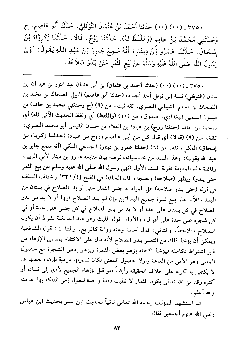 ٣٧٥٠ - (٠٠) (٠٠) (حدثنا أحمد بن عثمان) بن أبي عثمان عبد النور بن عبد الله بن سنان (النوفلي) نسبة إلى نوفل أحد أجداده (حدثنا أبو عاصم) النبيل الضحاك بن مخلد بن الضحاك بن مسلم الشيباني البصري، ثقة ثبت، من (٩) (ح وحدثني محمد بن حاتم) بن ميمون السمين البغدادي، صدوق، من (١٠) (واللفظ) أي ولفظ الحديث الآتي (له) أي لمحمد بن حاتم (حدثنا روح) بن عبادة بن العلاء بن حسان القيسي أبو محمد البصري، ثقة، من (٩) (قالا) أي قال كل من أبي عاصم وروح بن عبادة (حدثنا زكرياء بن إسحاق) المكي، ثقة، من (٦) (حدثنا عمرو بن دينار) الجمحي المكي (أنه سمع جابر بن عبد الله يقول): وهذا السند من خماسياته، غرضه بيان متابعة عمرو بن دينار لأبي الزبير، وفائدة هذه المتابعة تقوية السند الأول (نهى رسول الله صلى الله عليه وسلم عن بيع الثمر حتى يبدو) ويظهر (صلاحه) ونضجه، قال الحافظ في الفتح [٤/ ٣٣١] واختلف السلف في قوله (حتى يبدو صلاحه) هل المراد به جنس الثمار حتى لو بدا الصلاح في بستان من البلد مثلًا، جاز بيع ثمرة جميع البساتين وإن لم يبد الصلاح فيها أو لا بد من بدو الصلاح في كل بستان على حدة أو لا بد من بدو الصلاح في كل جنس على حدة أو في كل شجرة على حدة على أقوال، والأول: قول الليث وهو عند المالكية بشرط أن يكون الصلاح متلاحقًا، والثاني: قول أحمد وعنه رواية كالرابع، والثالث: قول الشافعية ويمكن أن يؤخذ ذلك من التعبير يبدو الصلاح لأنه دال على الاكتفاء بمسمى الإزهاء من غير اشتراط تكامله فيؤخذ اكتفاء بزهو بعض الثمرة وبزهو بعض الشجرة مع حصول المعنى وهو الأمن من العاهة ولولا حصول المعنى لكان تسميتها مزهية بإزهاء بعضها قد لا يكتفى به لكونه على خلاف الحقيقة وأيضًا فلو قيل بإزهاء الجميع لأدى إلى فساده أو أكثره وقد من الله تعالى بكون الثمار لا تطيب دفعة واحدة ليطول زمن التفكه بها اهـ منه والله أعلم.