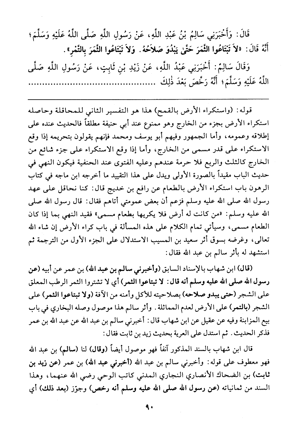 قَال: وَأَخْبَرَنِي سَالِمُ بْنُ عَبْدِ اللهِ، عَنْ رَسُولِ اللهِ صَلَّى اللهُ عَلَيهِ وَسَلَّمَ؛ أَنَّهُ قَال: "لَا تَبْتَاعُوا الثَّمَرَ حَتَّى يَبْدُوَ صَلاحُهُ. وَلَا تَبْتَاعُوا الثَّمَرَ بِالتَّمْرِ".