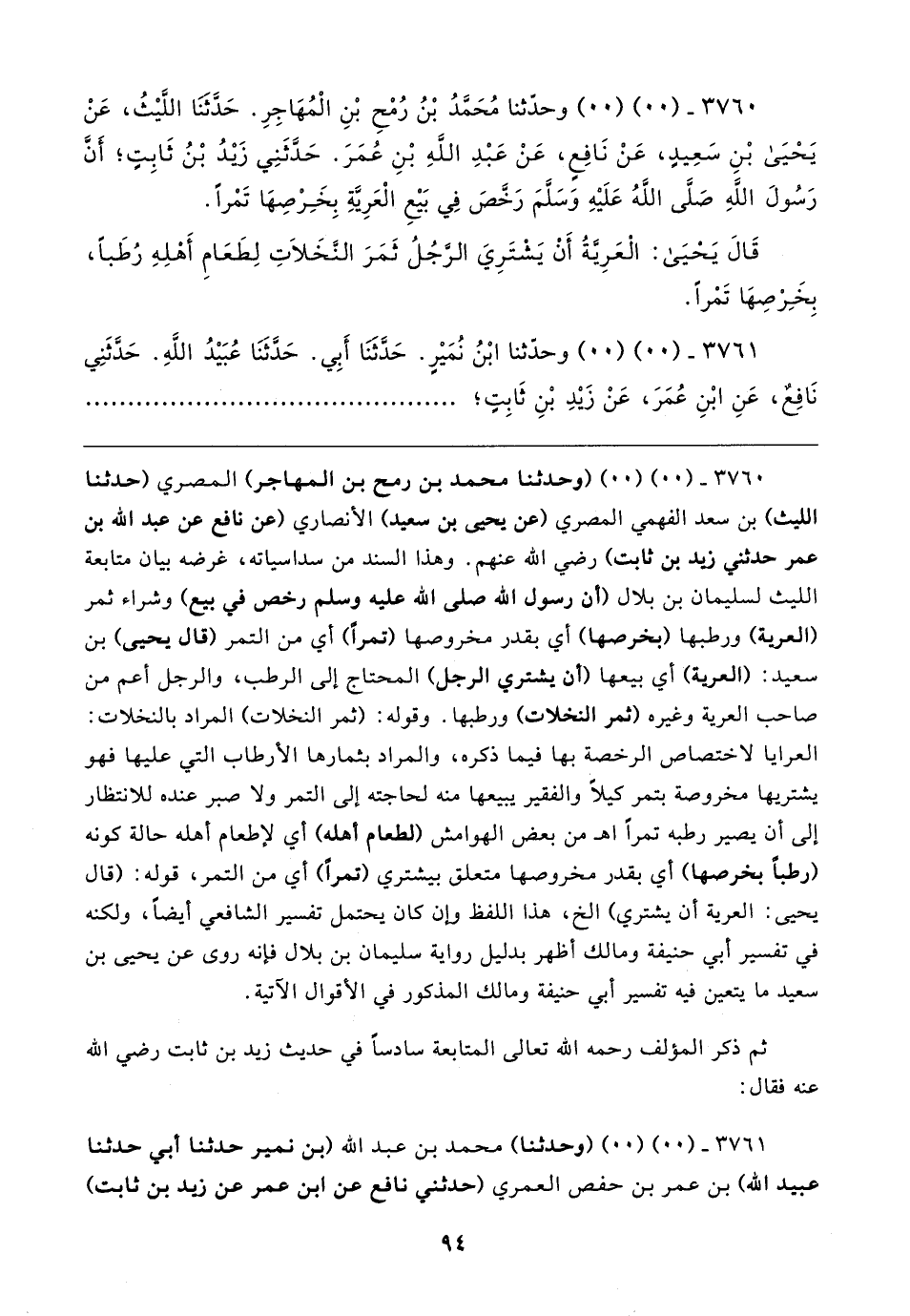 ٣٧٦٠ - (٠٠) (٠٠) (وحدثنا محمد بن رمح بن المهاجر) المصري (حدثنا الليث) بن سعد الفهمي المصري (عن يحيى بن سعيد) الأنصاري (عن نافع عن عبد الله بن عمر حدثني زيد بن ثابت) رضي الله عنهم. وهذا السند من سداسياته، غرضه بيان متابعة الليث لسليمان بن بلال (أن رسول الله صلى الله عليه وسلم رخص في بيع) وشراء ثمر (العرية) ورطبها (بخرصها) أي بقدر مخروصها (تمرًا) أي من التمر (قال يحيى) بن سعيد: (العرية) أي بيعها (أن يشتري الرجل) المحتاج إلى الرطب، والرجل أعم من صاحب العرية وغيره (ثمر النخلات) ورطبها. وقوله: (ثمر النخلات) المراد بالنخلات: العرايا لاختصاص الرخصة بها فيما ذكره، والمراد بثمارها الأرطاب التي عليها فهو يشتريها مخروصة بتمر كيلًا والفقير يبيعها منه لحاجته إلى التمر ولا صبر عنده للانتظار إلى أن يصير رطبه تمرًا هـ من بعض الهوامش (لطعام أهله) أي لإطعام أهله حالة كونه (رطبًا بخرصها) أي بقدر مخروصها متعلق بيشتري (تمرًا) أي من التمر، قوله: (قال يحيى: العرية أن يشتري) الخ، هذا اللفظ وإن كان يحتمل تفسير الشافعي أيضًا، ولكنه في تفسير أبي حنيفة ومالك أظهر بدليل رواية سليمان بن بلال فإنه روى عن يحيى بن سعيد ما يتعين فيه تفسير أبي حنيفة ومالك المذكور في الأقوال الآتية.