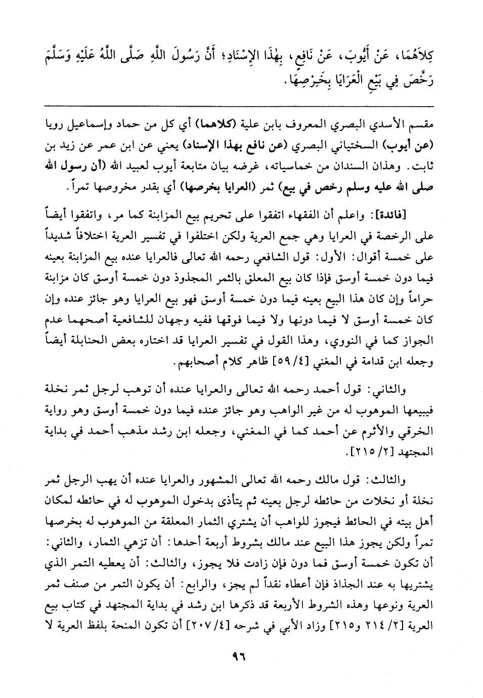 مقسم الأسدي البصري المعروف بابن علية (كلاهما) أي كل من حماد وإسماعيل رويا (عن أيوب) السختياني البصري (عن نافع بهذا الإسناد) يعني عن ابن عمر عن زيد بن ثابت. وهذان السندان من خماسياته، غرضه بيان متابعة أيوب لعبيد الله (أن رسول الله صلى الله عليه وسلم رخص في بيع) ثمر (العرايا بخرصها) أي بقدر مخروصها تمرًا.