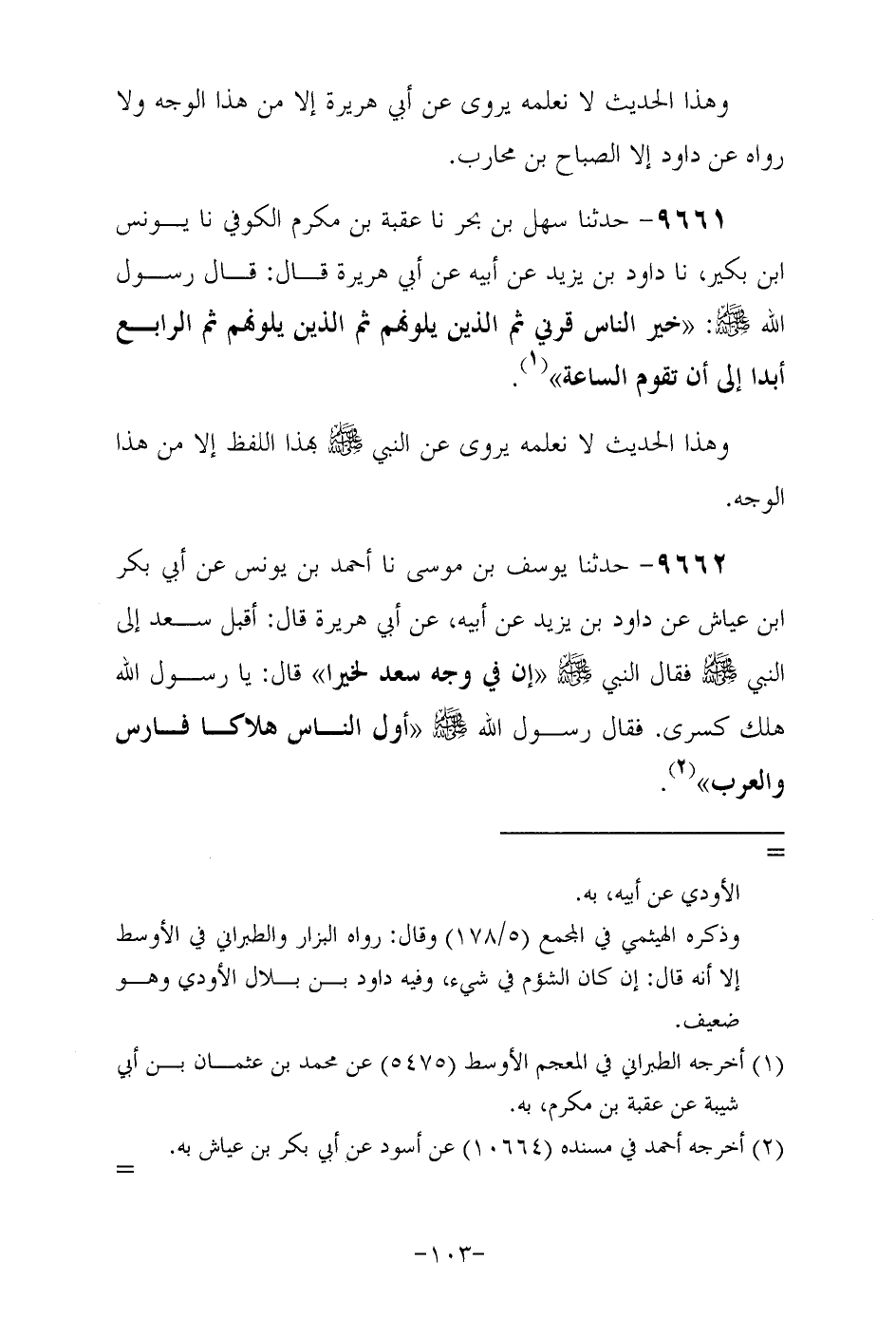 9662- حَدَّثَنا يوسف بن موسى , حَدَّثَنا أَحْمَد بْنُ يُونُسَ , عَنْ أَبِي بَكْرِ بْنِ عياش , عن داود بن يزيد , عن أبيه , عَنْ أَبِي هُرَيْرَةَ رَضِيَ اللهُ عَنْهُ , قال أقبل سعد إِلَى النَّبِيِّ صَلَّى اللهُ عَلَيْهِ وَسَلَّمَ فَقَالَ النَّبِيِّ صَلَّى اللهُ عَلَيْهِ وَسَلَّمَ إِنَّ فِي وجه سعد لخيرا قال يا رسول الله هلك كسرى فقَالَ رَسُولُ اللهِ صَلَّى اللهُ عَلَيْهِ وَسَلَّمَ: أول الناس هلاكا فارس والعرب.