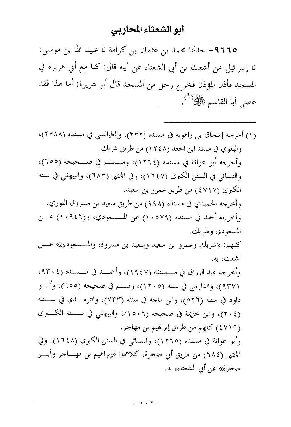 9665- حَدَّثَنا مُحَمَّد بن عثمان بن كرامة , حَدَّثَنا عبيد الله بن موسى , حَدَّثَنا إسرائيل , عن أشعث بن أبي الشعثاء , عن أبيه قال كنا مع أبي هريرة رضي الله عنه في المسجد فأذن المؤذن فخرج من المسجد قال أبو هريرة رضي الله عنه أما هذا فقد عصى أبا القاسم صَلَّى اللهُ عَلَيْهِ وَسَلَّمَ.