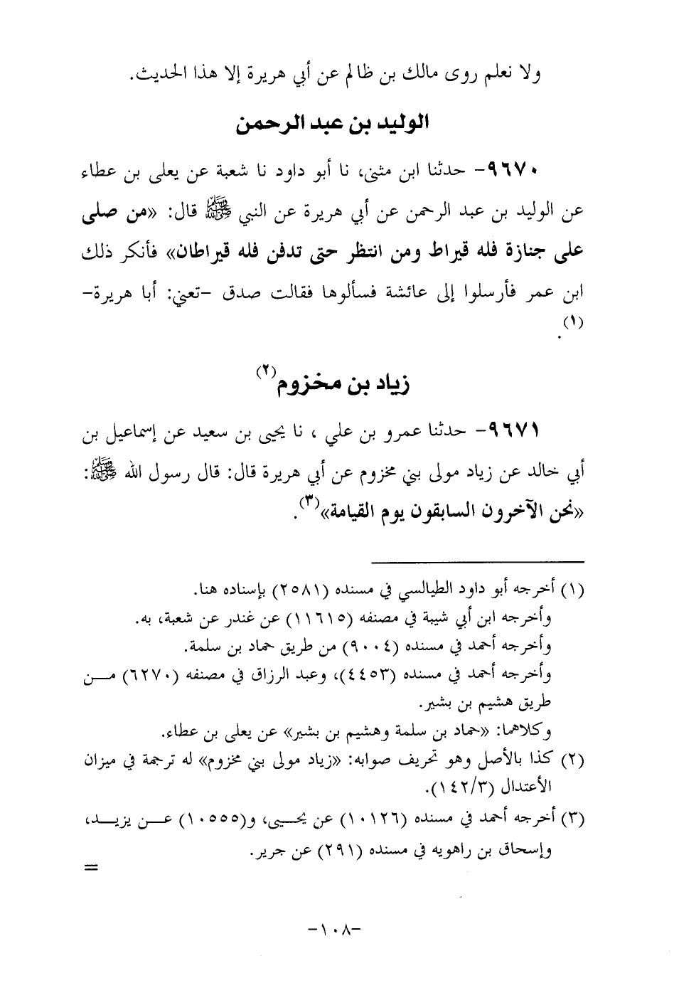 9671- حَدَّثَنا عمرو بن علي حَدَّثَنا يحيى بن سعيد , عن إسماعيل بن أبي خالد , عن زياد مولى بني مخزوم , عَنْ أَبِي هُرَيْرَةَ رَضِيَ اللهُ عَنْهُ , قَالَ: قَالَ رَسُولُ اللهِ صَلَّى اللهُ عَلَيْهِ وَسَلَّمَ: نحن الآخرون السابقون يوم القيامة.