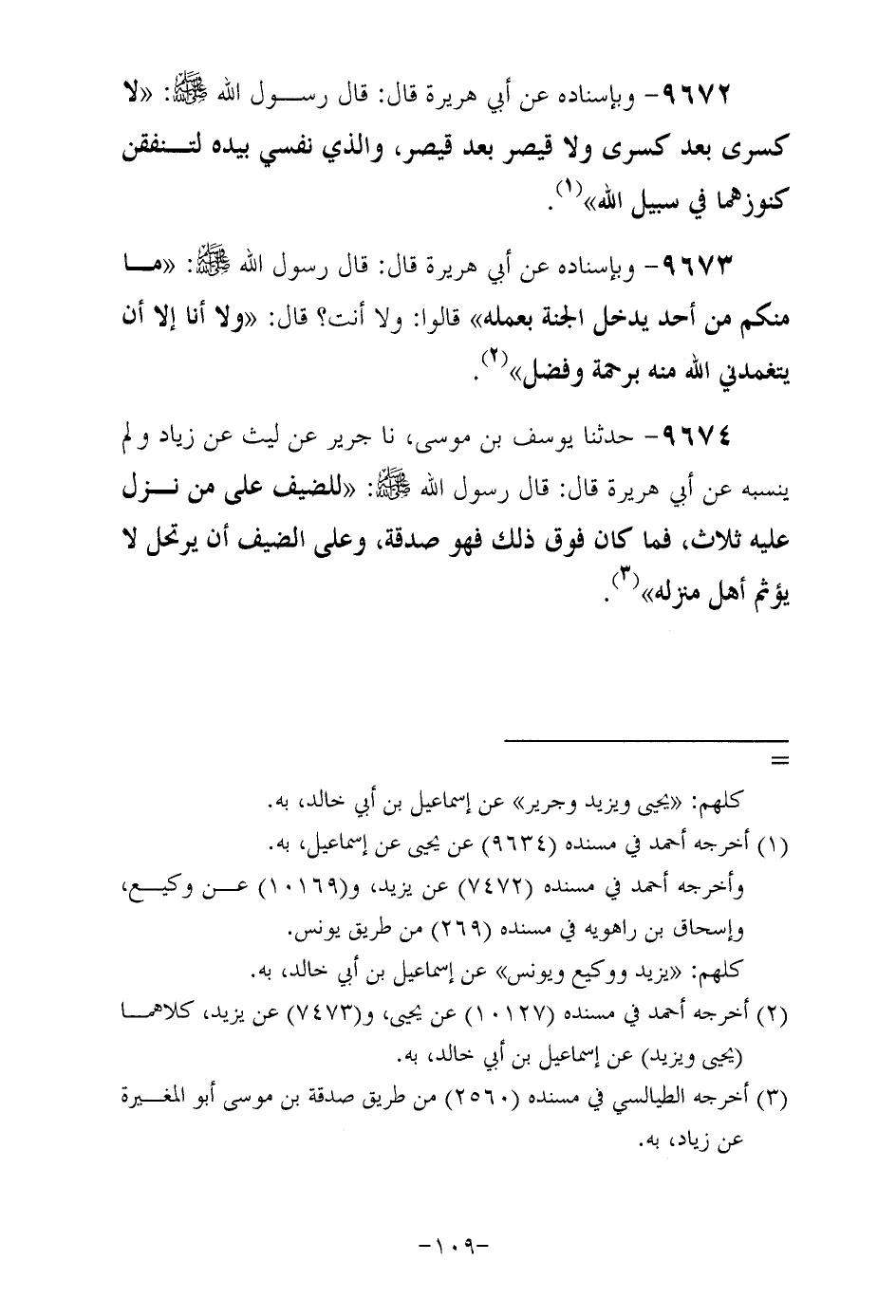 9672- وبإسناده , عَنْ أَبِي هُرَيْرَةَ رَضِيَ اللهُ عَنْهُ , قَالَ: قَالَ رَسُولُ اللهِ صَلَّى اللهُ عَلَيْهِ وَسَلَّمَ: لا كسى بعد كسرى ولا قيصر بعد قيصر وَالَّذِي نَفْسِي بِيَدِهِ لَتُنْفَقَنَّ كُنُوزُهُمَا فِي سَبِيلِ اللهِ عز وجل.