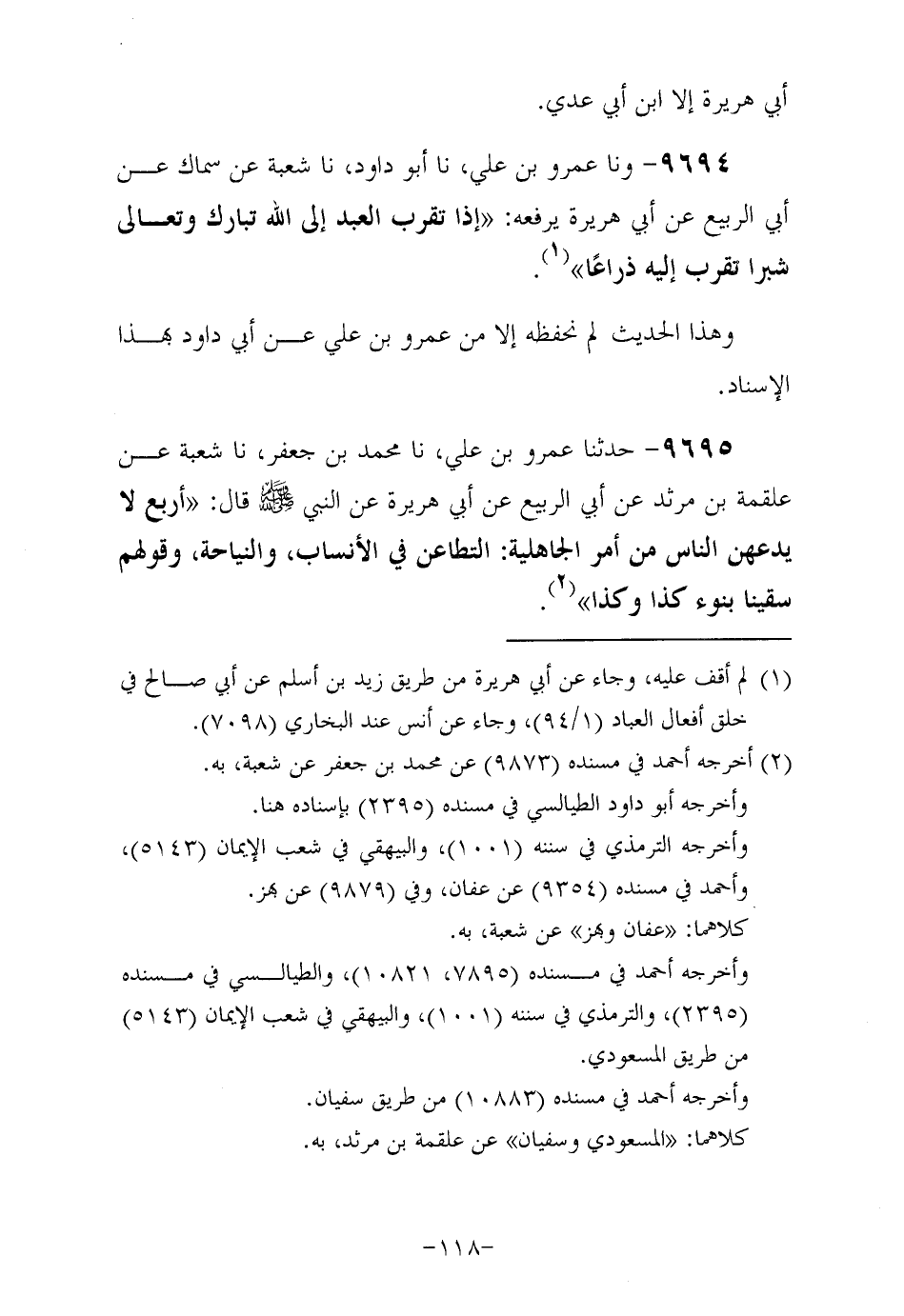 9694- وحَدَّثَنا عمرو بن علي حَدَّثَنا أبو داود , حَدَّثَنا شُعْبَة , عن سماك , عن أبي الربيع , عَنْ أَبِي هُرَيْرَةَ رَضِيَ اللهُ عَنْهُ , يرفعه إذا تقرب العبد إلى الله تبارك وتعالى شبرا تقرب إليه ذراعا.