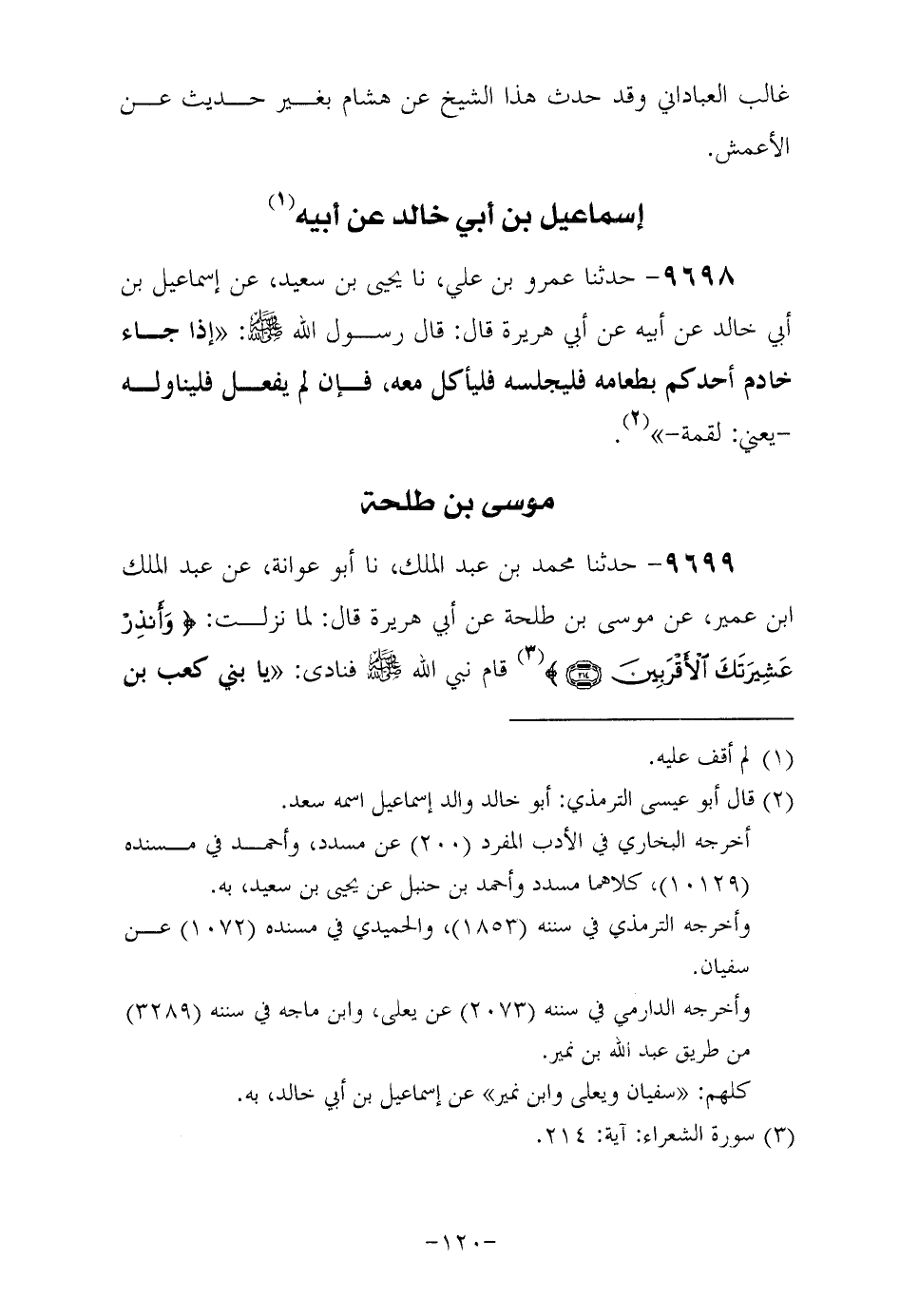 9698- حَدَّثَنا عمرو بن علي , حَدَّثَنا يحيى بن سعيد , عن إِسْمَاعِيل بن أَبِي خَالِد , عن أبيه , عَنْ أَبِي هُرَيْرَةَ رَضِيَ اللهُ عَنْهُ , قَالَ: قَالَ رَسُولُ اللهِ صَلَّى اللهُ عَلَيْهِ وَسَلَّمَ: إذا جاء خادم أحدكم بطعامه فليجلسه فليأكل معه فإن لم يفعل فليناوله يعني لقمة.
