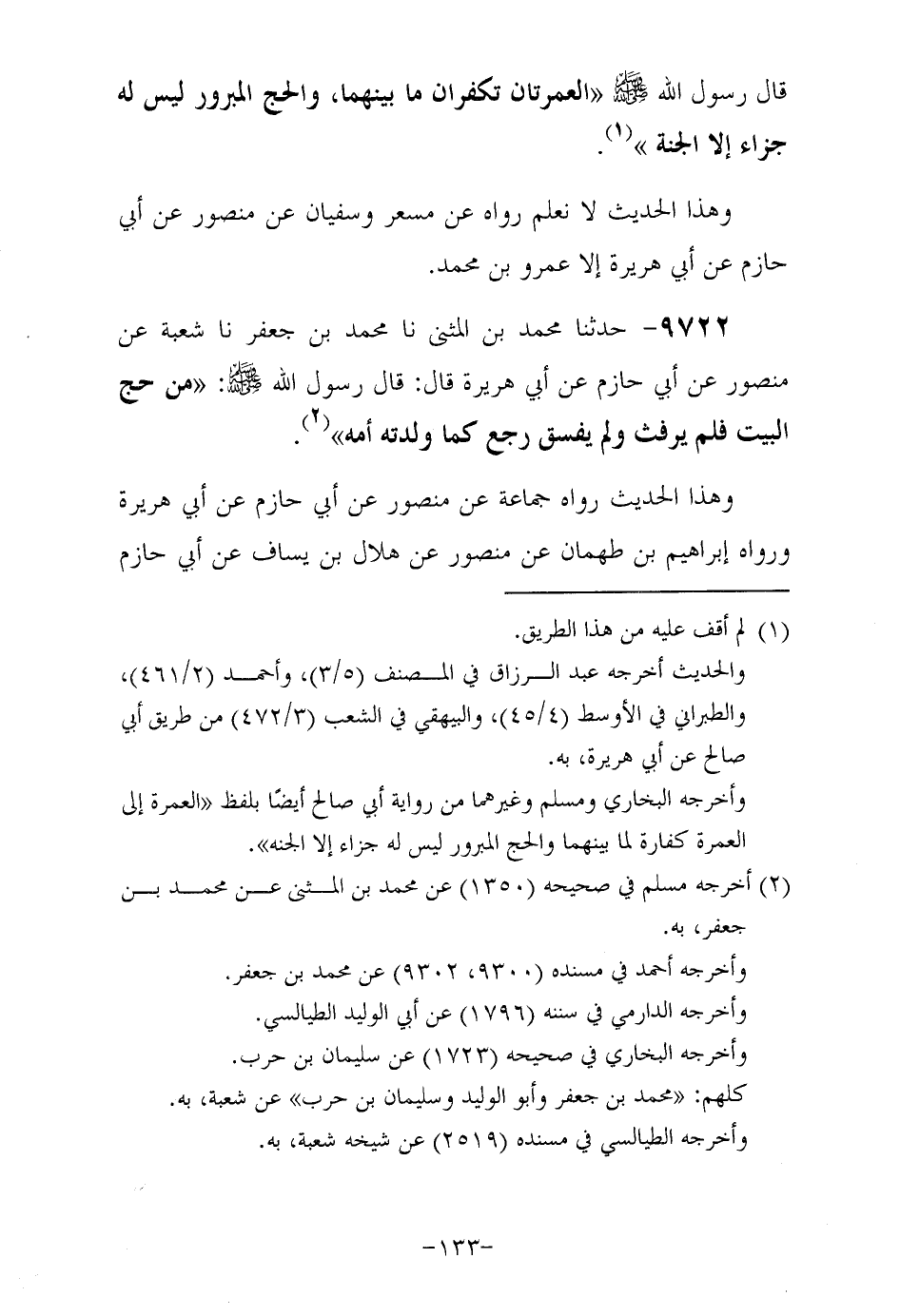 9722- حَدَّثَنا محمد بن المُثَنَّى , حَدَّثَنا مُحَمَّد بن جعفر حَدَّثَنا شُعْبة , عن مَنْصُور , عن أبي حازم , عَنْ أَبِي هُرَيْرَةَ رَضِيَ اللهُ عَنْهُ , قَالَ: قَالَ رَسُولُ اللهِ صَلَّى اللهُ عَلَيْهِ وَسَلَّمَ: من حج البيت فلم يرفث ولم يفسق رجع كما ولدته أمه.