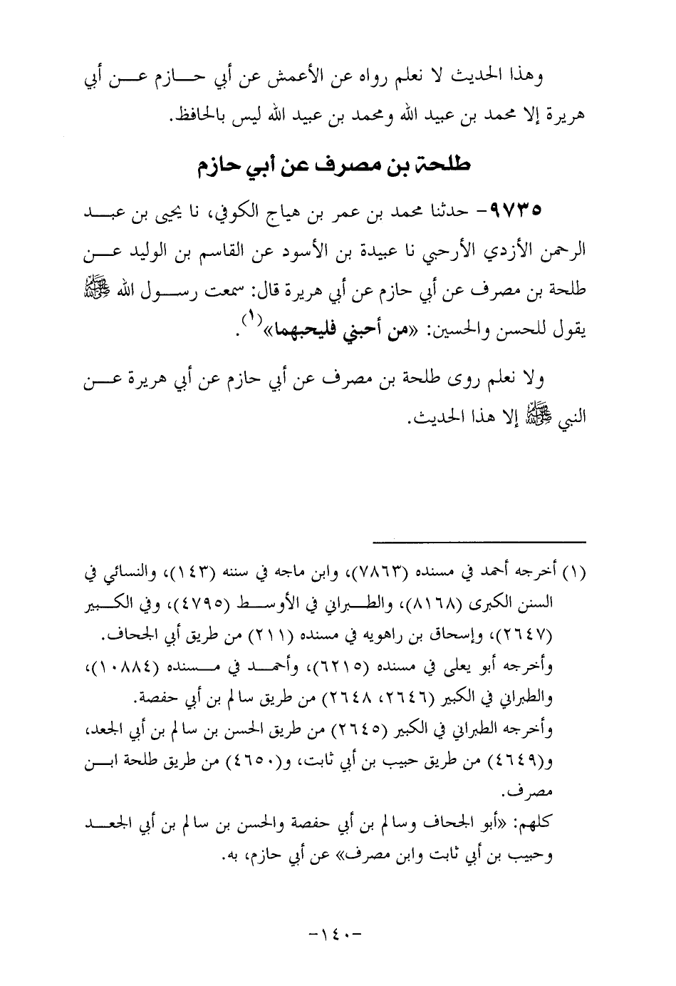 9735- حَدَّثَنا مُحَمَّد بْنُ عُمَرَ بْنِ هَيَّاجٍ الْكُوفِيُّ , حَدَّثَنا يحيى بن عبد الرحمن الأزدي الأرحبي , حَدَّثَنا عبيدة بن الأسود , عن القاسم بن الوليد , عن طلحة بن مصرف , عن أبي حازم , عَنْ أَبِي هُرَيْرَةَ رَضِيَ اللهُ عَنْهُ , قَالَ: سَمِعْتُ رَسُولَ اللَّهِ صَلَّى اللهُ عَلَيْهِ وَسَلَّمَ يقول للحسن والحسين من أحبني فليحبهما.