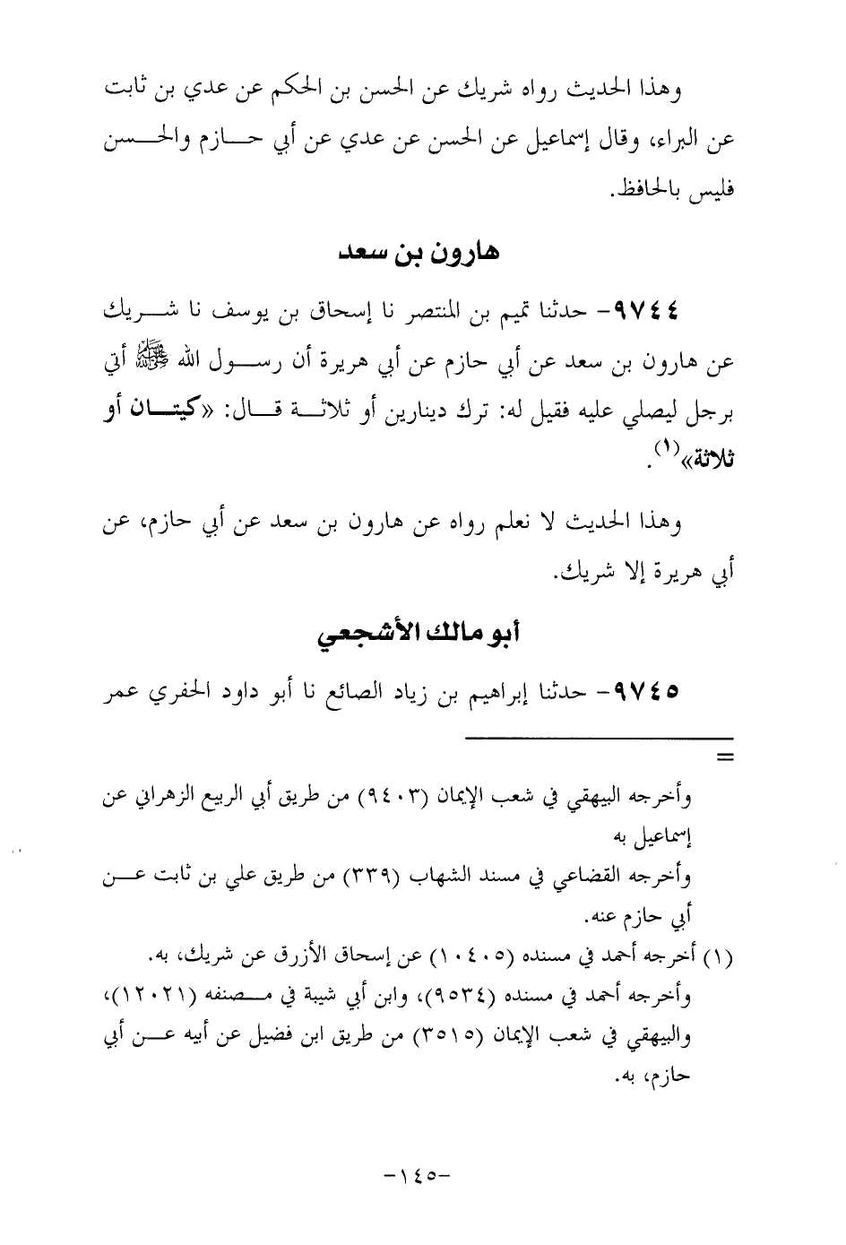 وهذا الحديثُ لاَ نَعْلَمُ رَوَاهُ عن هارون بن سعد , عن أبي حازم , عَنْ أَبِي هُرَيْرَةَ رَضِيَ اللهُ عَنْهُ , إلا شريك.