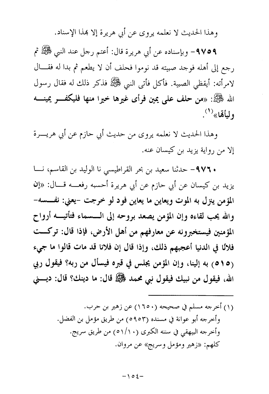 9759- وبإسناده , عَنْ أَبِي هُرَيْرَةَ رَضِيَ اللهُ عَنْهُ , قال أعتم رجل عند النبي صَلَّى اللهُ عَلَيْهِ وَسَلَّمَ ثم رجع إلى أهله فوجد صبيته قد نوموا فحلف أن لا يطعم ثم بدا له فقال لامراته أيقظي الصبية فأكل فَأَتَى النَّبِيَّ صَلَّى اللهُ عَلَيْهِ وَسَلَّمَ فَذَكَرَ ذلك لَهُ فقَالَ رَسُولُ اللهِ صَلَّى اللهُ عَلَيْهِ وَسَلَّمَ: من حلف على يمين فرأى غيرها خيرا منها فليكفر يمينه وليأتها.