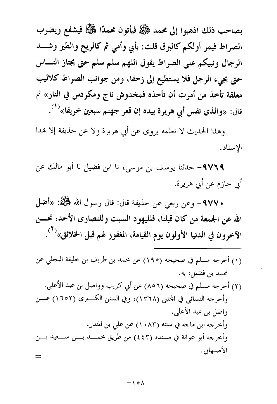 9770- وعن ربعي , عن حذيفة قَالَ: قَالَ رَسُولُ اللهِ صَلَّى اللهُ عَلَيْهِ وَسَلَّمَ: أضل الله عن الجمعة من كان قبلنا فلليهود السبت وللنصارى الأحد نحن الآخرون في الدنيا , الأولون يوم القيامة , المغفور لهم قبل الخلائق.