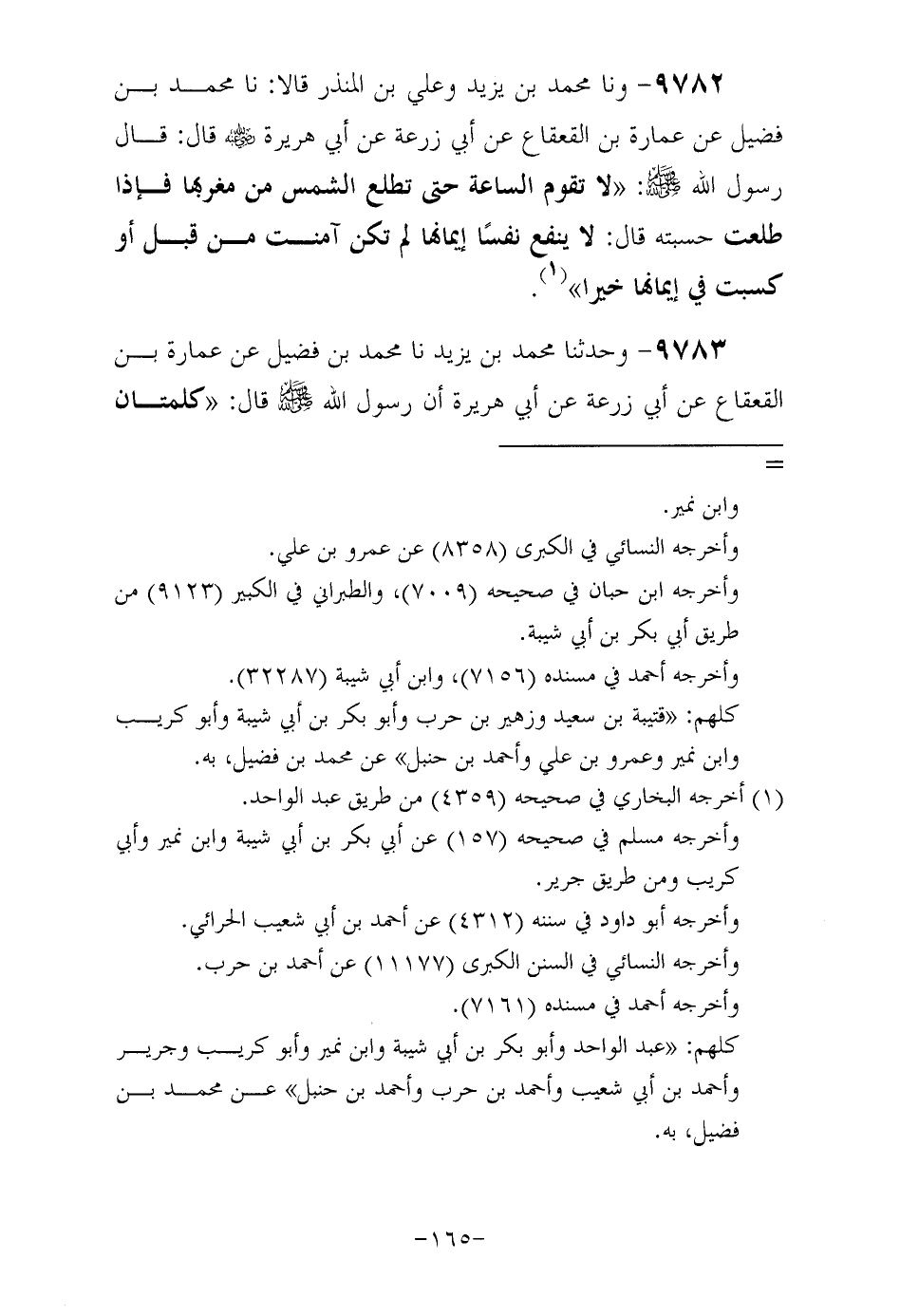 9782- وَحَدَّثَنا مُحَمَّد بن يَزِيد وعلي بن المنذر قَالاَ: حَدَّثَنا مُحَمَّد بن فضيل , عن عمارة بن القعقاع , عن أَبِي زُرْعَة , عَنْ أَبِي هُرَيْرَةَ رَضِيَ اللهُ عَنْهُ قَالَ: قَالَ رَسُولُ اللهِ صَلَّى اللهُ عَلَيْهِ وَسَلَّمَ: لَا تَقُومُ السَّاعَةُ حتى تطلع الشمس من مغربها , فإذا طلعت حسبته قال لا ينفع نفسا إيمانها لم تكن آمنت من قبل أو كسبت في إيمانها خيرا.