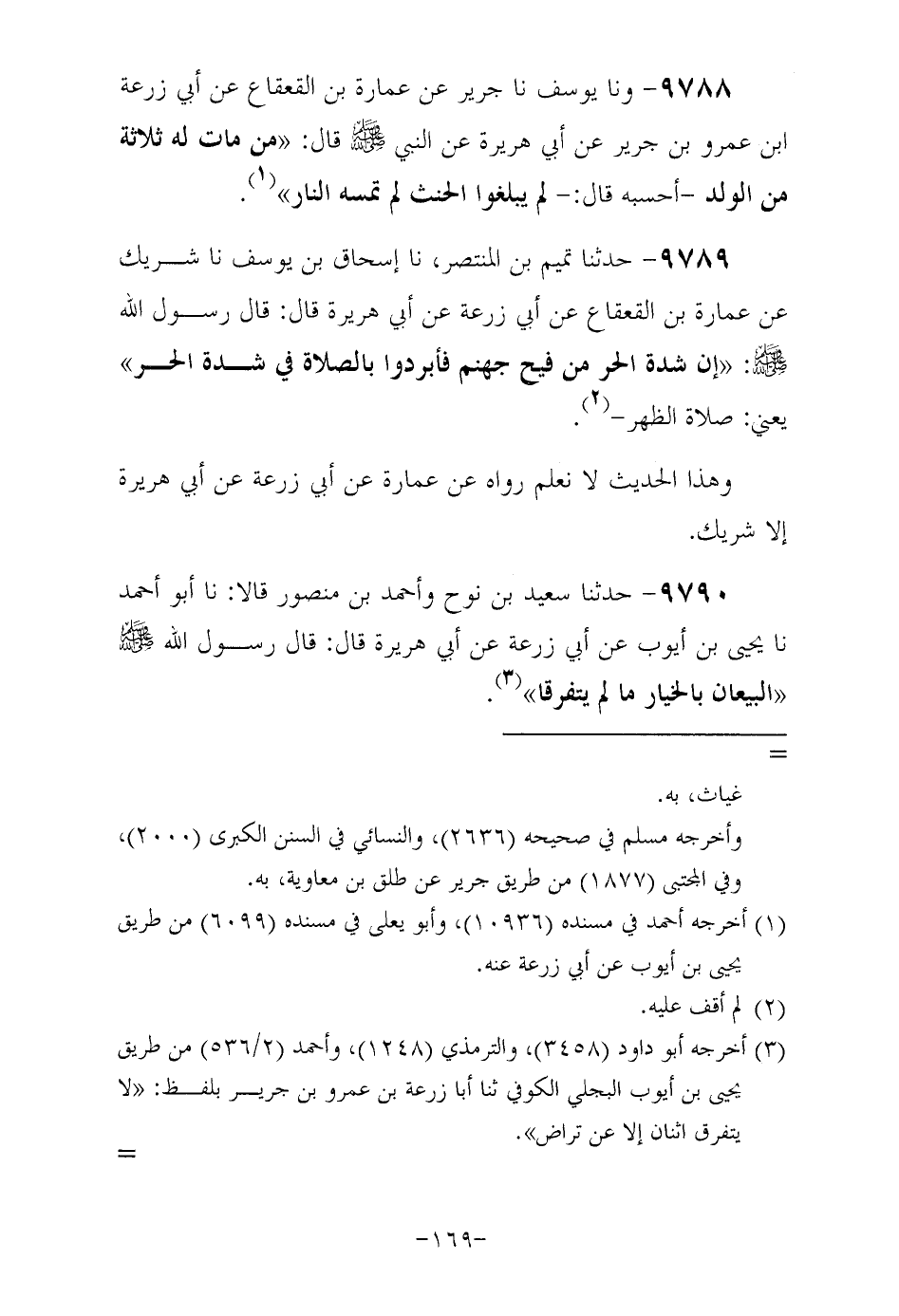 9790- حَدَّثَنا سعيد بن نوح وأَحْمَد بن مَنْصُور قَالاَ: حَدَّثَنا أبو أحمد , حَدَّثَنا يحيى بن أيوب , عن أَبِي زُرْعَة , عَنْ أَبِي هُرَيْرَةَ رَضِيَ اللهُ عَنْهُ قَالَ: قَالَ رَسُولُ اللهِ صَلَّى اللهُ عَلَيْهِ وَسَلَّمَ: الْبَيِّعَانِ بِالْخِيَارِ مَا لم يتفرقا.