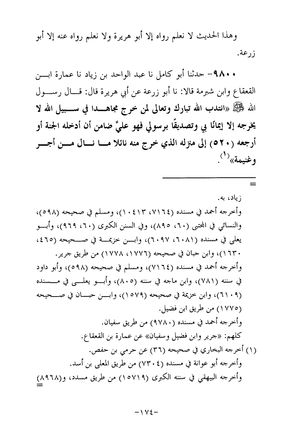 9800- حَدَّثَنا أبو كامل , حَدَّثَنا عبد الواحد بن زياد , حَدَّثَنا عمارة بن القعقاع وابن شبرمة قَالاَ: حَدَّثَنا أبو زرعة , عَنْ أَبِي هُرَيْرَةَ رَضِيَ اللهُ عَنْهُ , قَالَ: قَالَ رَسُولُ اللهِ صَلَّى اللهُ عَلَيْهِ وَسَلَّمَ: انتدب الله تبارك وتعالى لمن خرج مجاهدا في سبيل الله لا يخرجه إلا إيمانا بي وتصديقا برسولي فهو علي ضامن أن أدخله الجنة أو أرجعه إلى منزله الذي خرج منه نائلا ما نال من أجر وغنيمة.