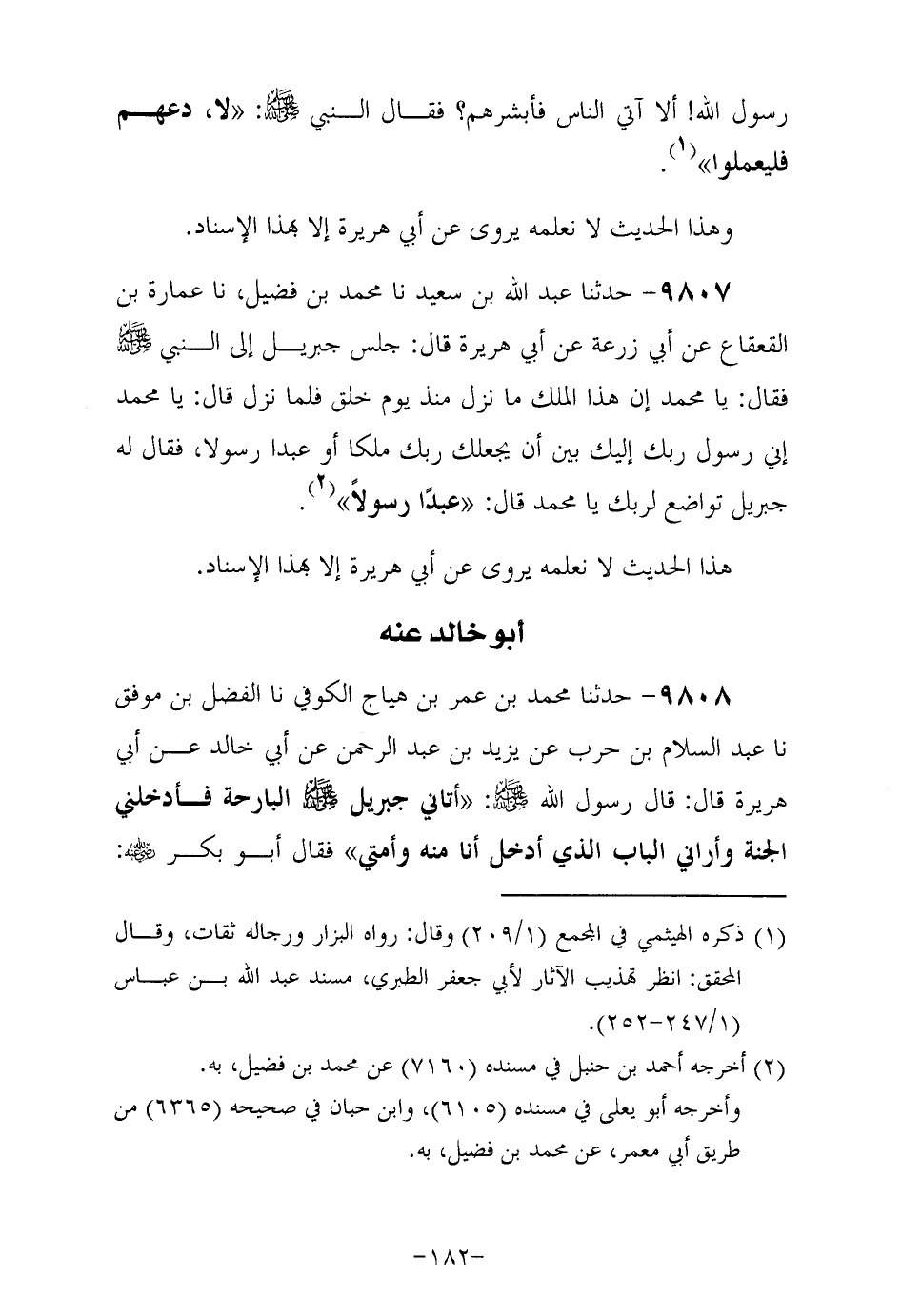 9807- حَدَّثَنا عبد الله بن سعيد , حَدَّثَنا مُحَمَّد بن فضيل , حَدَّثَنا عمارة بن القعقاع , عن أَبِي زُرْعَة , عَنْ أَبِي هُرَيْرَةَ رَضِيَ اللهُ عَنْهُ قال جلس جِبْرِيلُ إِلَى النَّبِيِّ صَلَّى اللهُ عَلَيْهِ وَسَلَّمَ فقال يا مُحَمَّد إن هذا الملك ما نزل منذ يوم خلق فلما نزل قال يا مُحَمَّد إني رسول ربك إليك بين أن يجعلك ربك ملكا أو عبدا رسوا فقال له جبريل عليه السلام تواضع لربك يا مُحَمَّد قال عبدا رسولا.