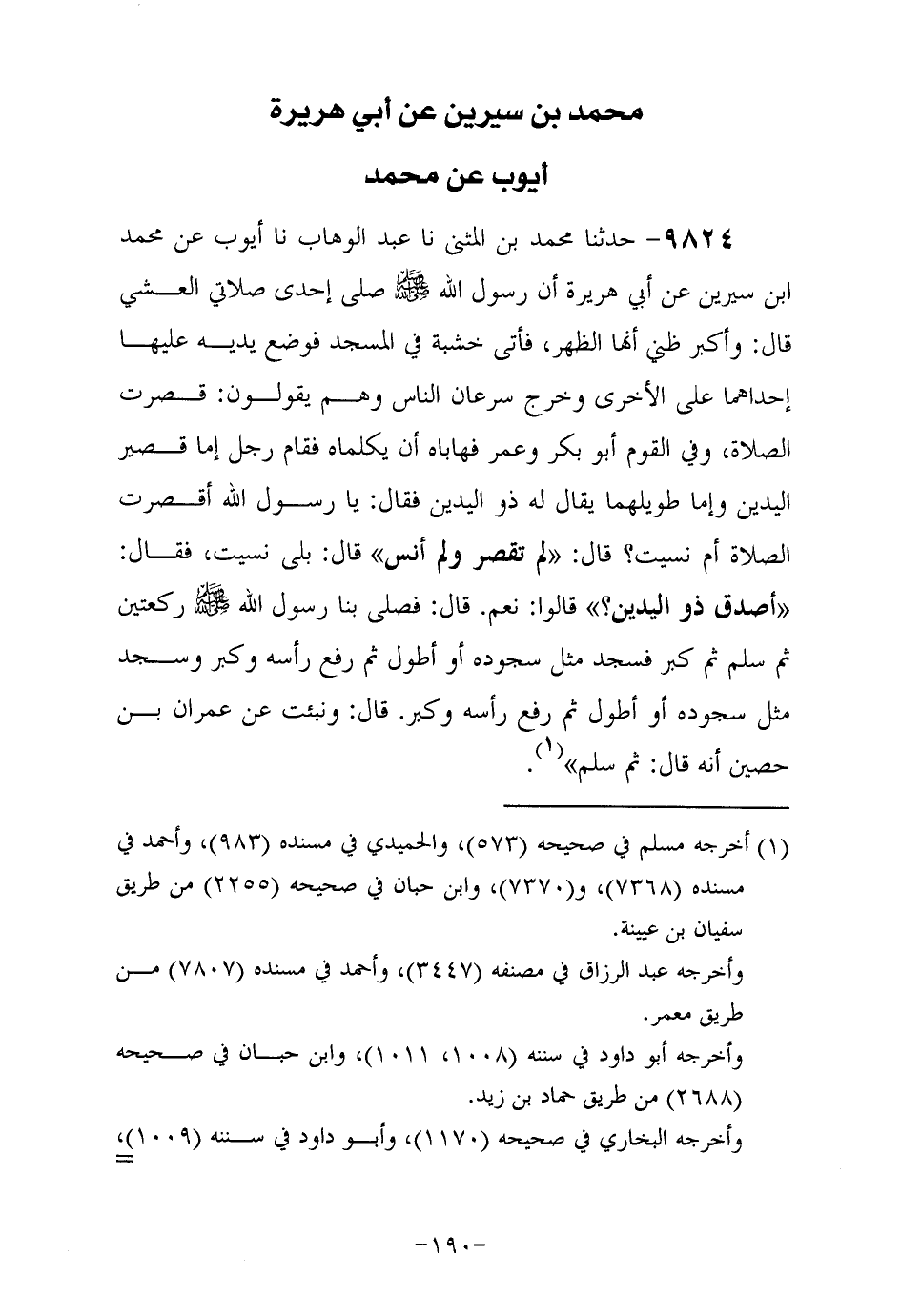 9824- حَدَّثَنا محمد بن المُثَنَّى , حَدَّثَنا عبد الوهاب , حَدَّثَنا أيوب , عن محمد بن سيرين , عَنْ أَبِي هُرَيْرَةَ رَضِيَ اللهُ عَنْهُ أَنَّ رَسُولَ اللَّهِ صَلَّى اللهُ عَلَيْهِ وَسَلَّمَ صَلَّى إِحْدَى صَلاتَيِ الْعِشِيِّ قال وأكبر ظني أنها الظهر فأتى خشبة في المسجد فوضع يديه عليها إحداهما على الأخرى وخرج سرعان الناس وهم يقولون قصرت الصلاة وفي القوم أبو بَكْر وعمر فهاباه أن يكلماه فقام رجل إما قصير اليدين وإما طويلهما يقال له ذو اليدين فقال يا رسول الله أقصرت الصلاة أم نسيت قال لم تقصر ولم أنس قال بلى نسيت فقال أصدق ذو اليدين قالوا نعم قال فصلى بِنَا رَسُولُ اللَّهِ صَلَّى اللهُ عَلَيْهِ وَسَلَّمَ ركعتين ثم سلم ثم كبر فسجد مثل سجوده أو أطول ثم رفع رأسه وكبر وسجد مثل سجوده أو أطول ثم رفع رأسه وكبر.