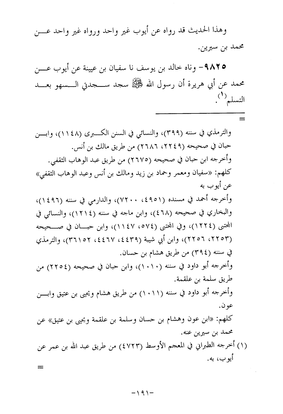 9825- وحَدَّثَناه خالد بن يوسف حَدَّثَنا سُفْيَانُ بْنُ عُيَيْنَةَ , عَنْ أَيُّوبَ , عَنْ مُحَمَّد , عَنْ أَبِي هُرَيْرَةَ رَضِيَ اللهُ عَنْهُ , أَنَّ رَسُولَ اللَّهِ صَلَّى اللهُ عَلَيْهِ وَسَلَّمَ سجد سجدتي السهو بعد التسليم.