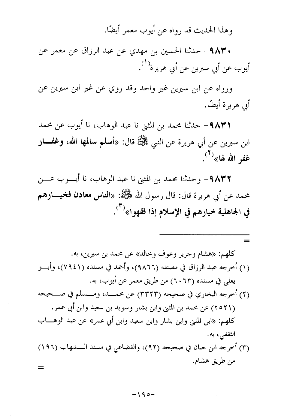 9830- حَدَّثَنا الحُسَين بن مهدي , عن عَبْدُ الرَّزَّاقِ , عَنْ مَعْمَرٍ , عَنْ أَيُّوبَ عَنْ ابن سيرين , عَنْ أَبِي هُرَيْرَةَ رَضِيَ اللهُ عَنْهُ.