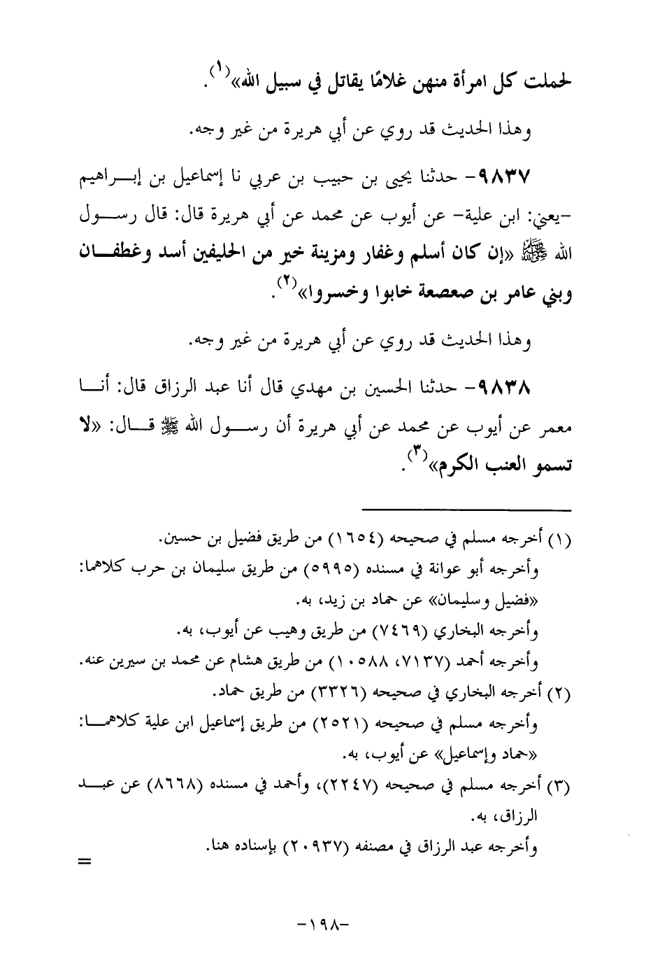 9837- حَدَّثَنا يحيى بن حبيب بن عربي حَدَّثَنا إسماعيل بن إبراهيم يعني ابن علية , عن أيوب , عن محمد , عَنْ أَبِي هُرَيْرَةَ رَضِيَ اللهُ عَنْهُ , قَالَ: قَالَ رَسُولُ اللهِ صَلَّى اللهُ عَلَيْهِ وَسَلَّمَ: إن كان أسلم وغفار ومزينة خير من الحليفين أسد وغطفان وبني عامر بن صعصعة خابوا وخسروا.