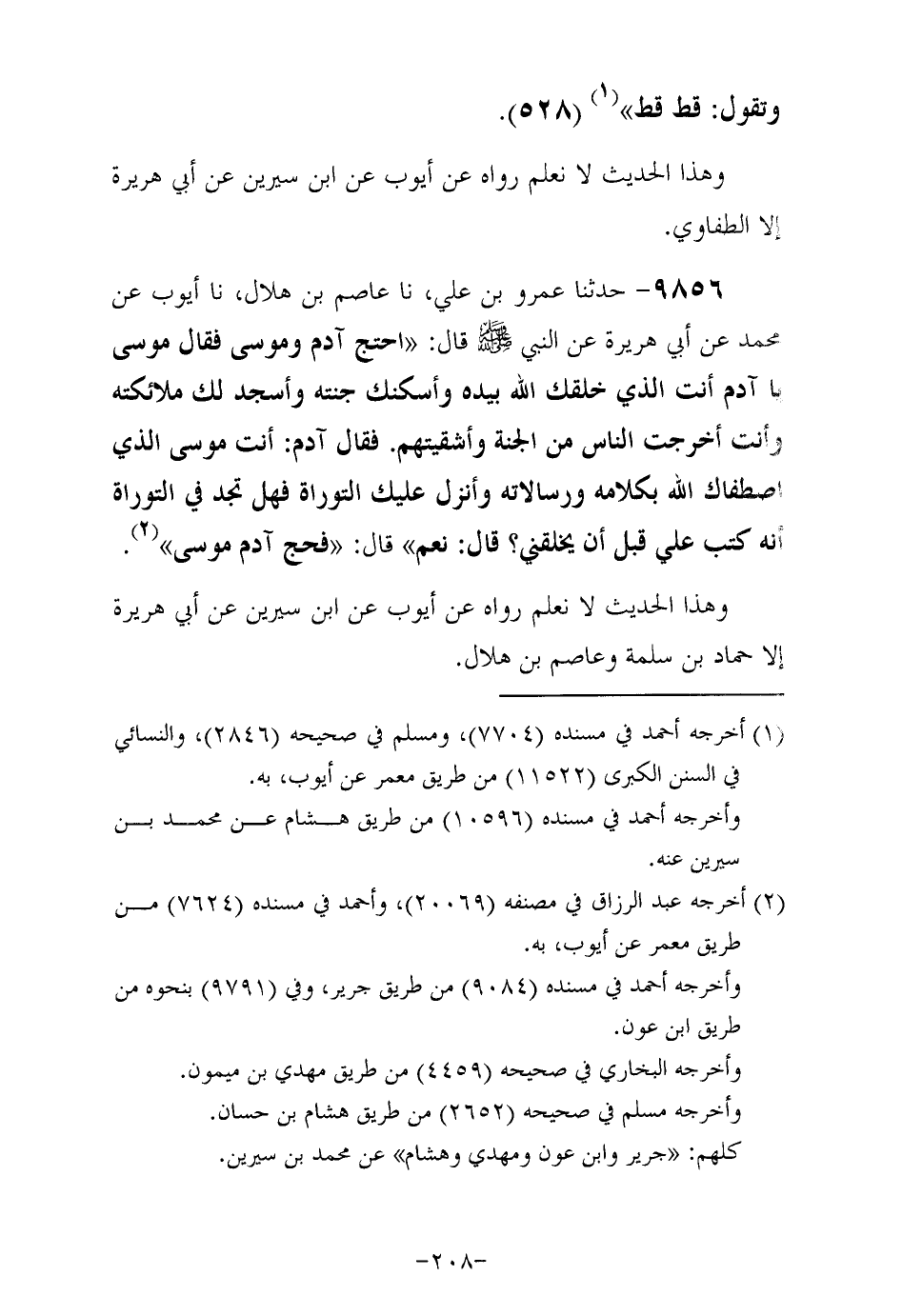 9856- حَدَّثَنا عمرو بن علي , حَدَّثَنا عاصم بن هلال , حَدَّثَنا أيوب , عن مُحَمَّد , عَنْ أَبِي هُرَيْرَةَ رَضِيَ اللهُ عَنْهُ , عَنِ النَّبِي صَلَّى اللهُ عَلَيْهِ وَسَلَّمَ قال: احتج آدم وموسى فقال موسى يا آدم أنت الذي خلقك الله بيده وأسكنك جنته وأسجد لك ملائكته وأنت أخرجت الناس من الجنة وأشقيتهم فقال آدم أنت موسى الذي اصفااك الله بكلامه ورسالاته وأنزل عليك التوراة فهل تجد في التوراة أنه كتب علي قبل أن يخلقني قال نعم قال فحج آدم موسى.