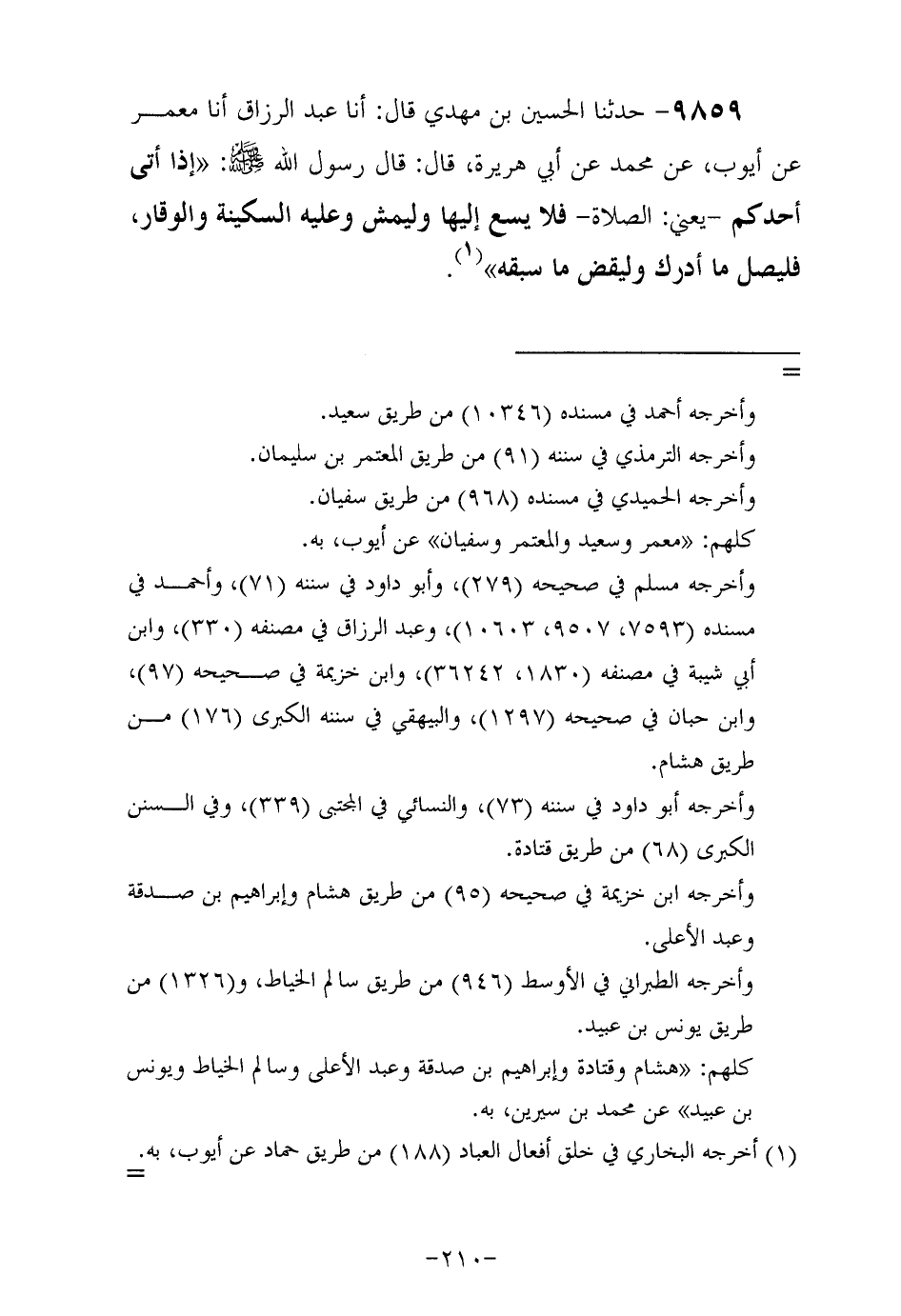 9859- حَدَّثَنا الحُسَين بن مهدي قال: أخبرنا عبد الرزاق , أَخْبَرنَا معمر , عن أيوب , عن مُحَمَّد , عَنْ أَبِي هُرَيْرَةَ رَضِيَ اللهُ عَنْهُ , قَالَ: قَالَ رَسُولُ اللهِ صَلَّى اللهُ عَلَيْهِ وَسَلَّمَ: إذا أتى أحدكم يعني الصلاة فلا يسع إليها وليمش وعليه السكينة والوقار فَلْيُصَلِّ مَا أَدْرَكَ وَلْيَقْضِ مَا سَبَقَهُ.