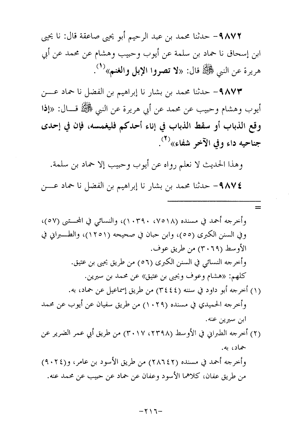 9873- حَدَّثَنا مُحَمَّد بن بشار , حَدَّثَنا إبراهيم بن الفضل , حَدَّثَنا حماد , عن أيوب وهشام وحبيب , عن مُحَمَّد , عَنْ أَبِي هُرَيْرَةَ رَضِيَ اللهُ عَنْهُ , عَنِ النَّبِي صَلَّى اللهُ عَلَيْهِ وَسَلَّمَ قَالَ: إِذَا وقع الذباب أو سقط في إناء أحدكم فليغمسه فإن في إحدى جَنَاحَيْهِ دَاءً وَفِي الآخَرِ شِفَاءً.